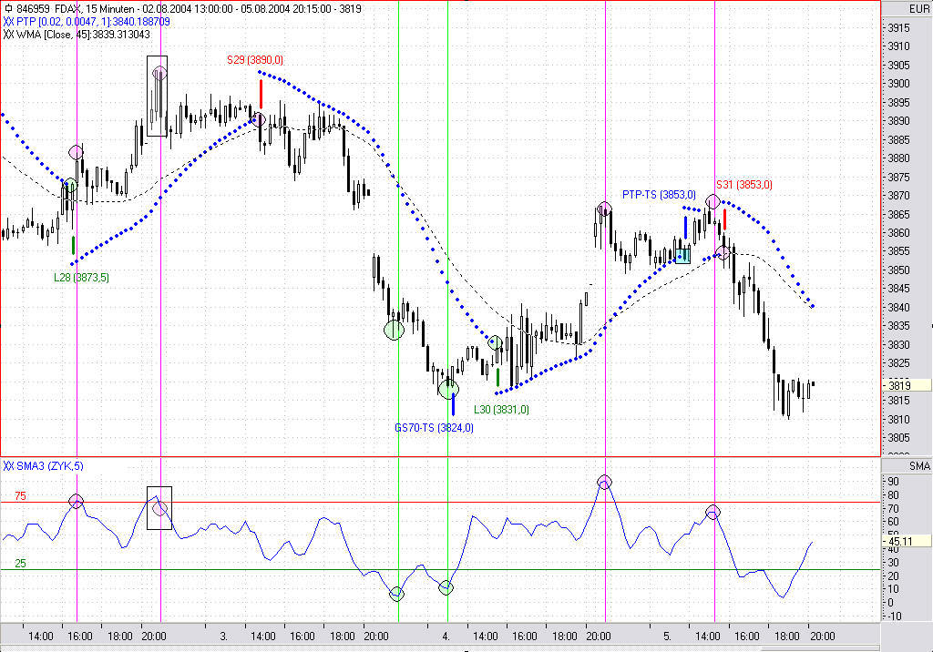 Für morgen gilt es lediglich die eingegangene Short-Position, die sich bereits komfortabel im Buchgewinn befindet, mit dem PTP-TS fortzuführen und evtl. den GS70-TS bei einem "aktivierten" Gegensignal zu beachten. Nicht mehr und nicht weniger.