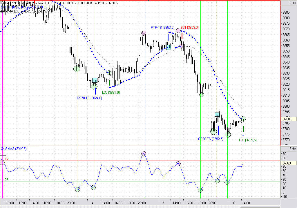 Ein Gegensignal wurde durch den ZYK5 bisher noch nicht "aktiviert" da dieser weiter abfällt und somit sogar eine bärische Divergenz zum Kursverlauf ausbildet. Dieses "Phänomen" tritt immer nach großen Kurslücken auf. Das neuerliche Zwischentief ist somit noch nicht vollständig ausgebildet. Der GS70-TS würde nun zur Ausführung kommen, sobald der ZYK5 einen Periodenschluss (15min) über dem Vorperiodenschluss zeigen sollte.