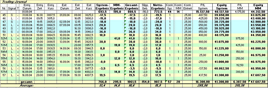 Alle Angaben erfolgen brutto ohne Slippage und Gebühren und beziehen sich auf einen FDAX-Kontrakt. Werden mehrere Kontrakte gehandelt wird das Systemergebnis addiert und somit konsolidiert dargestellt. Die Netto-Performance kann dem wöchentlich/monatlich veröffentlichten Factsheet entnommen werden. -