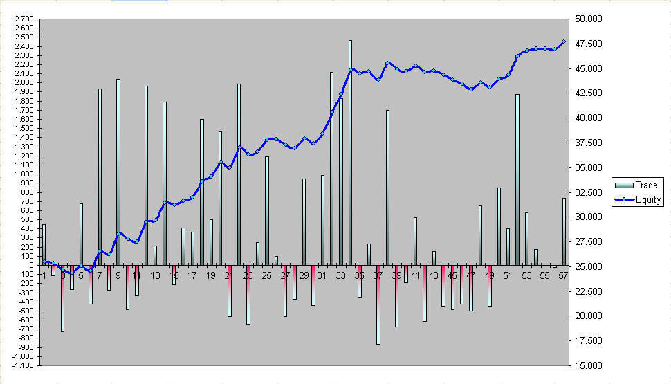 Und hier nochmals eine Darstellung der im Depot gehandelten Einzeltrades. Auffällig ist hierbei die absolute Verlustbegrenzung auf ein "Minimum", ohne dabei die Gewinntrades zu sehr einzuschränken. Auch die Trefferquote ist mit 56% durchaus akzeptabel.