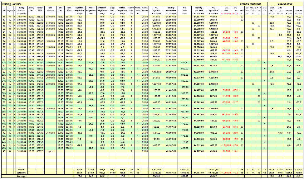 Der Monat August war mit einer System-Performance (ohne MM), incl. Slippage + Gebühren, i.H.v. +356,5P und einem Average-Trade i.H.v. +12,5P (29 Trades) bisher der lukrativste Monat. Inclusive dem unterlegten MM betrug die Performance +540,5P. Das MM steuerte bisher somit +184,0P oder € 4600,00 netto zum Gesamtergebnis bei.