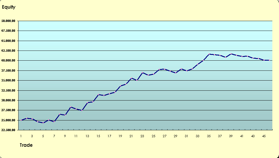 Anbei noch die Equity-Verlauf-Darstellung seit 13.07.2004 inclusive Money-Management. Auffällig ist hierbei, dass diese seit den letzten zehn Trades auf hohem Niveau konsolidiert, ohne jedoch in eine größere Draw-Down-Phase überzugehen. Dies ist ausschließlich auf den mittlerweile zusätzlich gehandelten Money-Management-Kontrakt zurückzuführen. Über einen einzelnen Standard-Kontrakt wäre dieses Ergebnis nicht zu "halten" gewesen.