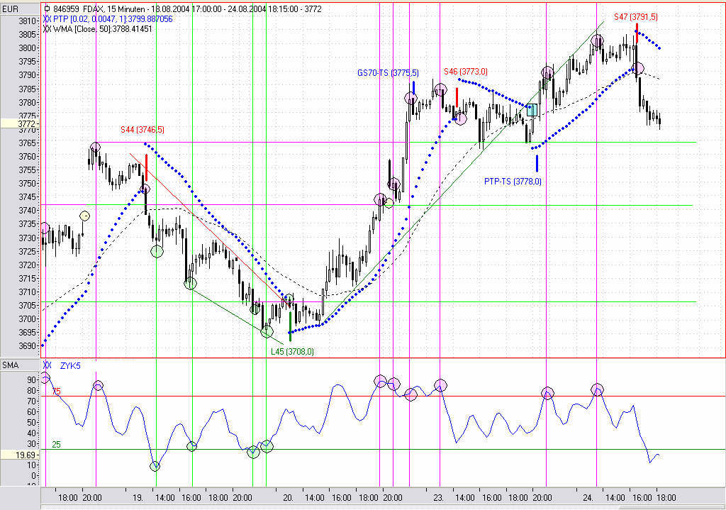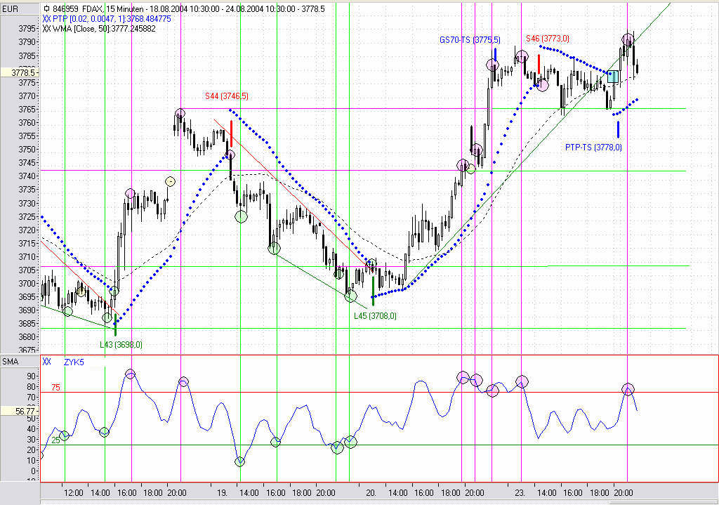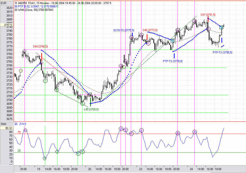 Das mit dem vorzeitigen Rückkauf eines Kontraktes hat sich zwischenzeitlich erledigt, da die Position gesamt über den PTP-TS ausgestoppt wurde. Man schaue sich dabei mal den Reaktionsverlauf des Indikators etwas genauer an.