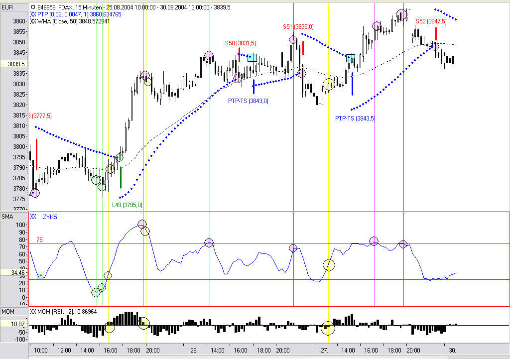 Im Kassa-DAX wird es aufgrund der verkürzten (unterschiedlichen) Handelszeiten zwangsläufig immer zu zeitlich unterschiedlichen Signalen in Bezug auf den FDAX kommen. Daher auch der unterschiedliche parabole Verlauf des PTP.