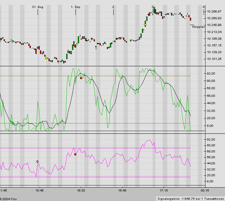 Selbst auf dieser Ebene (15-min Charts) müßte man mit einen TS von bis zu 100 Punkten im Dax arbeiten. Also bringen längere Zeitebenen (30-min oder 60-min Charts) eigentlich nichts. Hinzu kommen die geänderten Handelszeiten ab November 2003.