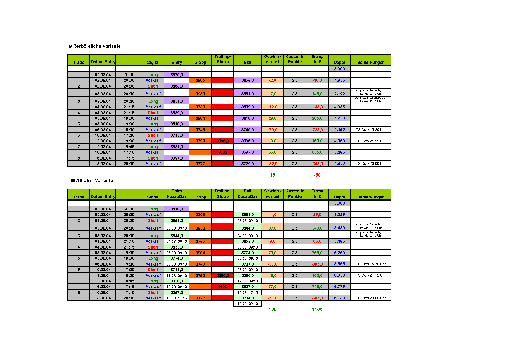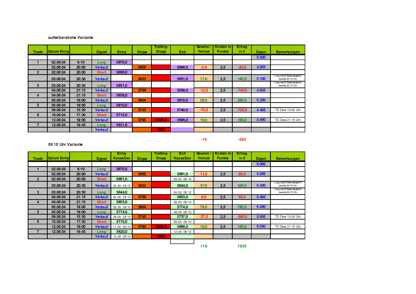 Während bei der "außerbörslichen Variante" im Monat August bisher ein Verlust von 19 Punkten entstanden ist, so brachte es die "09:10 Uhr-Variante" auf einen Gewinn von 118 (!) Punkten.
