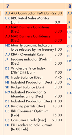 Schaust du auf untere Newsvorschauliste des Tages 07 im Februar, siehst du 00.30 GMT mit aufgeführt. 30 pips im Aussie zu Newszeiten im Gegensatz zu 10 pips bei EURUSD sind auch keine Seltenheit sondern eher die Regel (bei wichtigen Ereignissen).There was NO news event! I've been trading with Oanda for years and I know what to do before a news event.