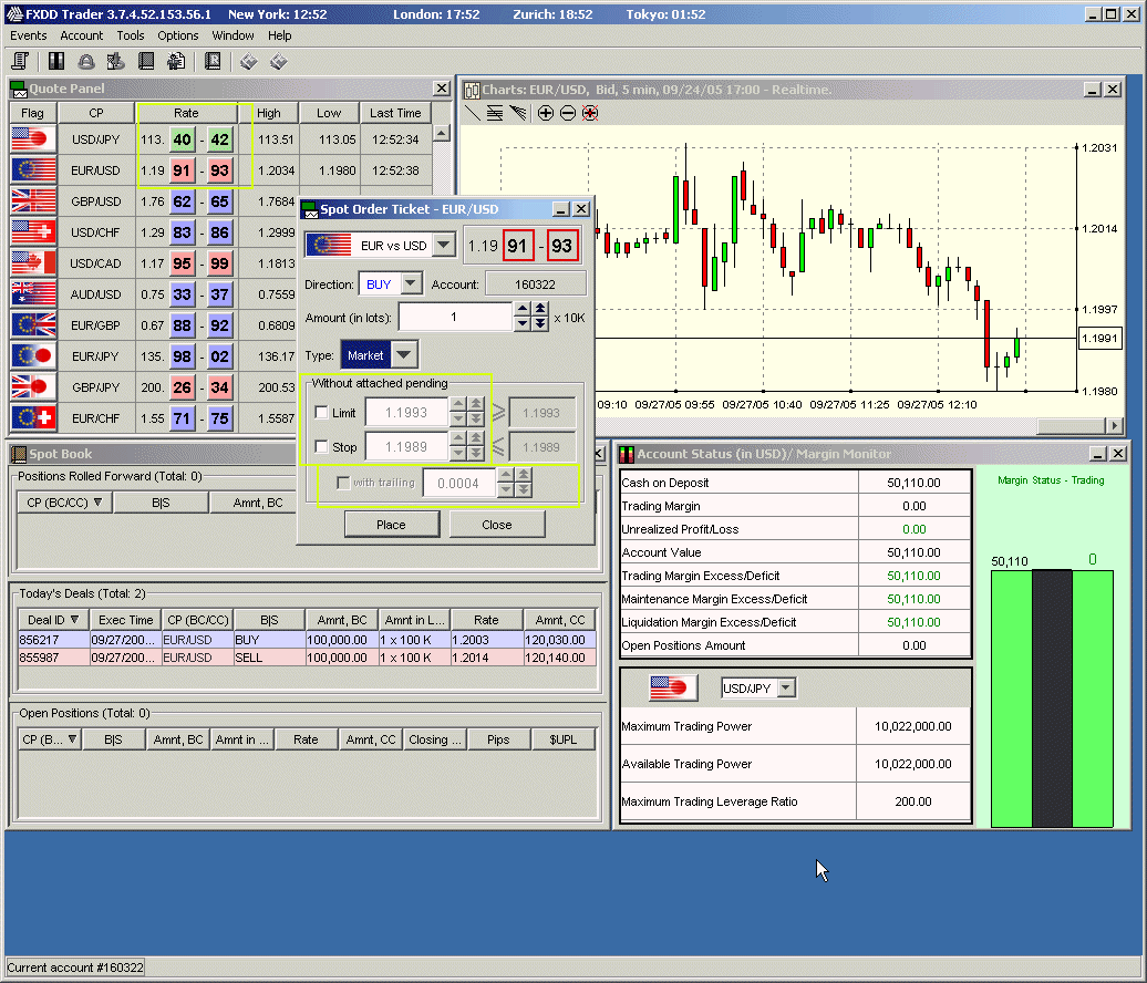 Ebenfalls 2 Pip Spread. Der Spread ist in der Regel um ein Pip gegenüber dem Spread von IDealpro verschoben und langsamer. was aber normal ist bei den Forex Buden. Also im normalen Tradingumfeld scheinbar auf jedenfall zu gebrauchen. Wie es in heißen Newsphasen ist kann ich noch nicht sagen. Gute finde ich, das ich mit F9 sofort die Ordermaske bekomme. Ist automatisch auf "Market" eingestellt. Das automatisch "Pending" -so heißt be denen jegliche Art von Limitorders - erscheint kann man wohl nicht einstellen.
