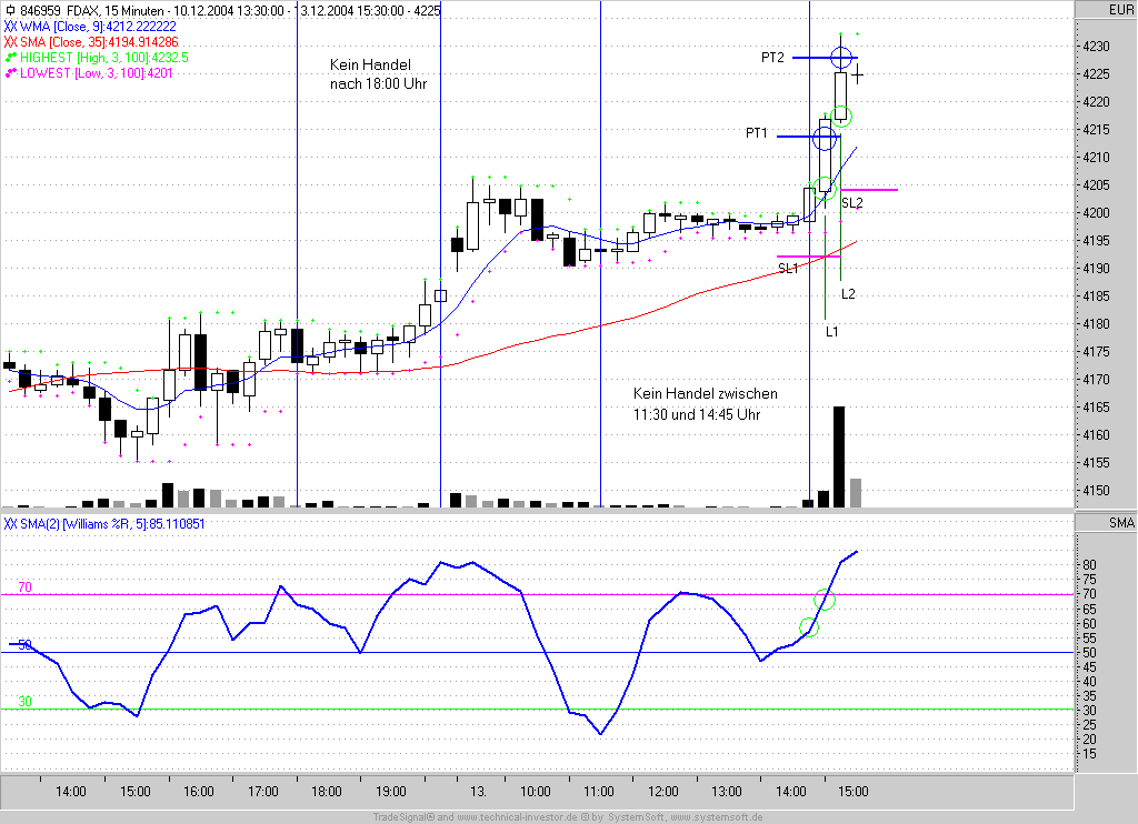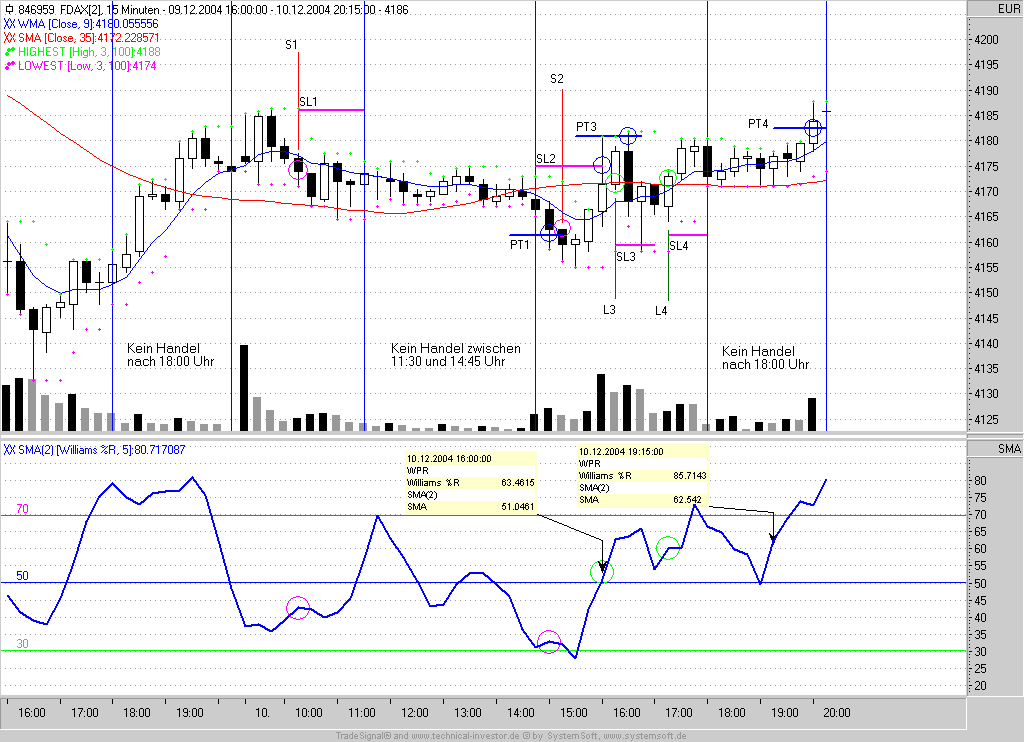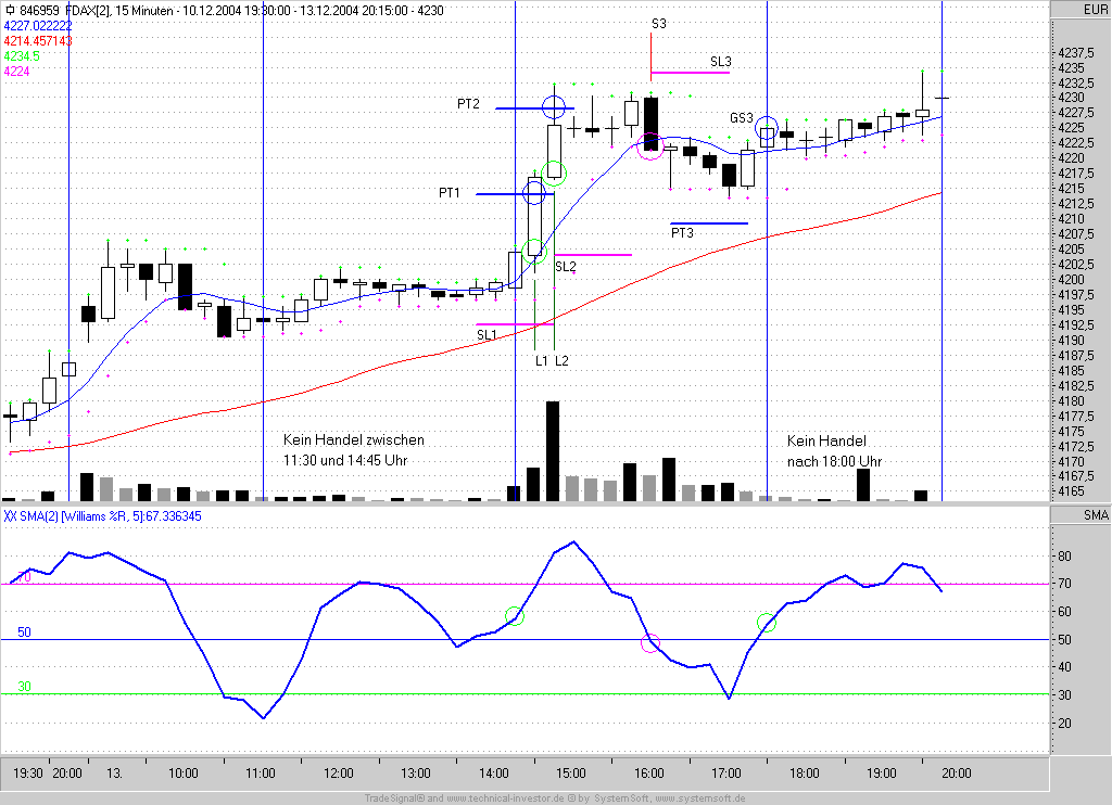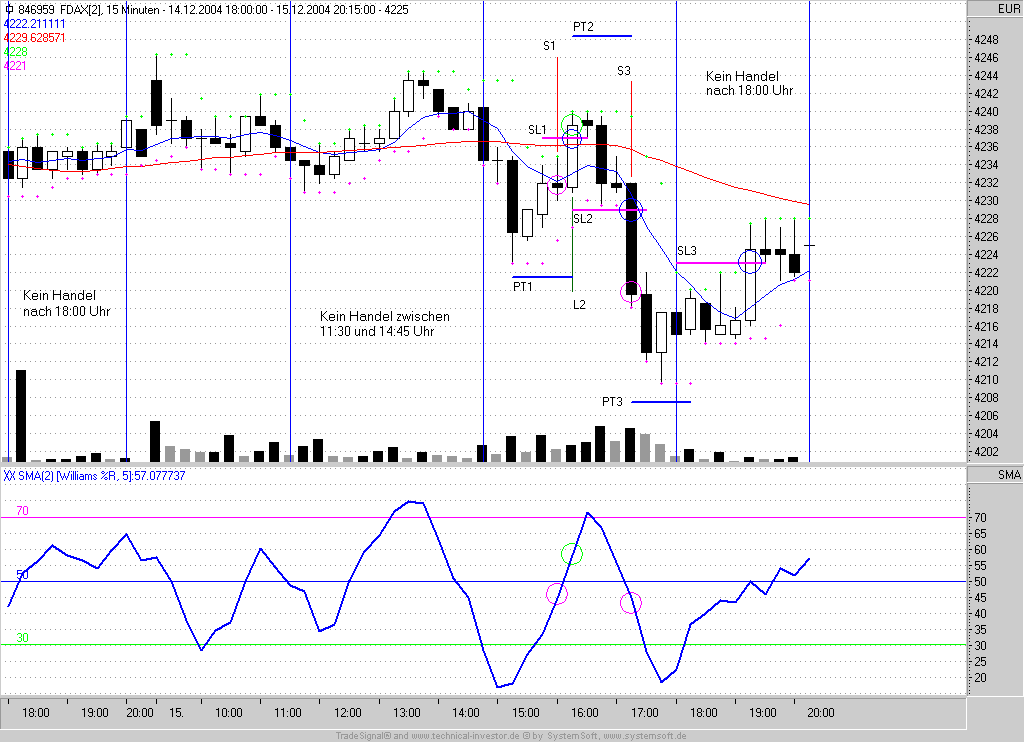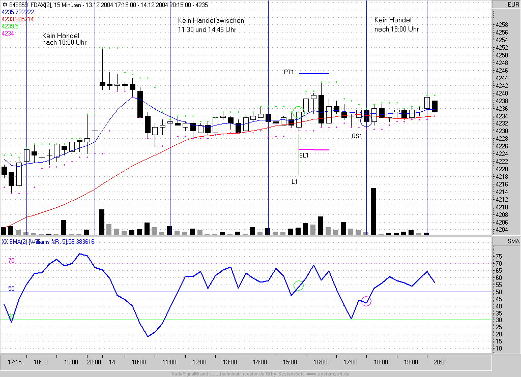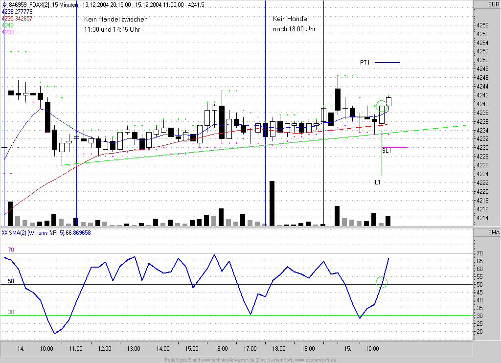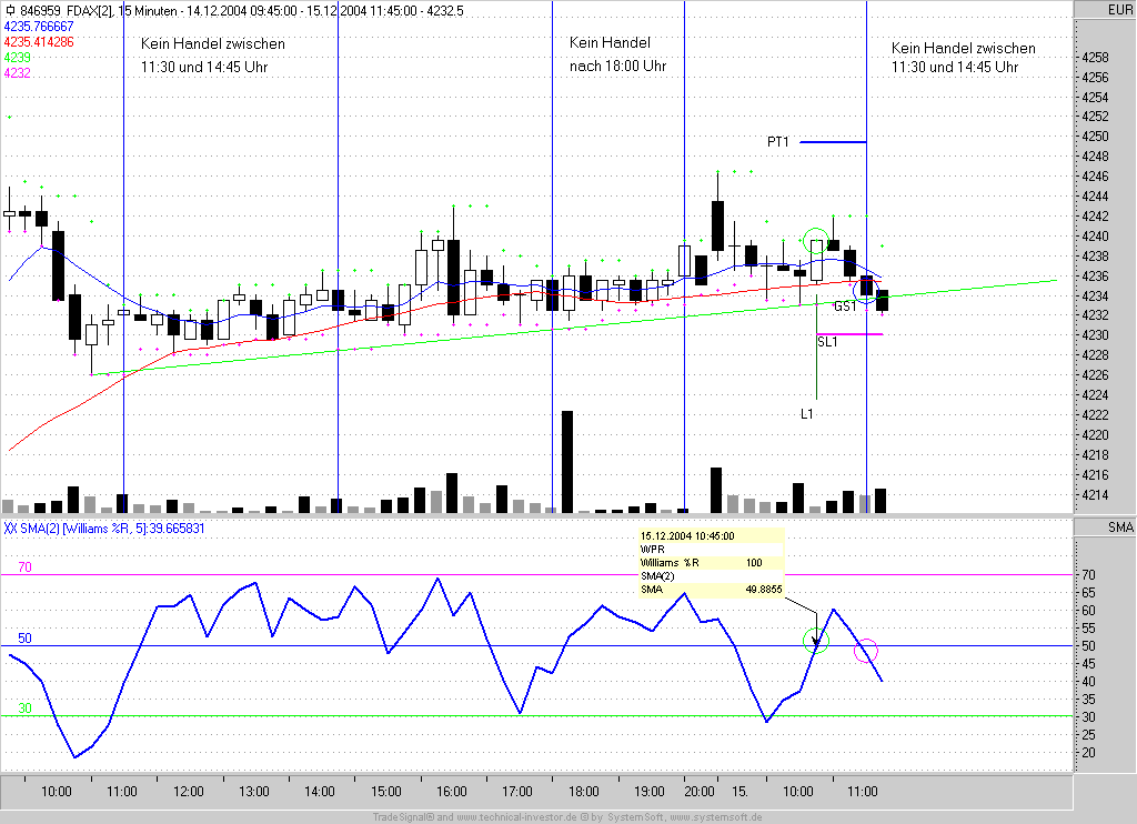 Mich würde mal interessieren, ob bei anderen Kurssystemen um 10:45 der W%R unter oder über 50% stand. Im nachhinein wird mir nämlich ein Wert von unter 50% angezeigt. Da habe ich wohl Mist gebaut. Von daher habe ich die Position am Gegensignal mit -5,5P geschlossen. Da es jedoch in die Handelszeitbeschränkung fällt, wird dieses meinerseits nicht mehr umgesetzt.