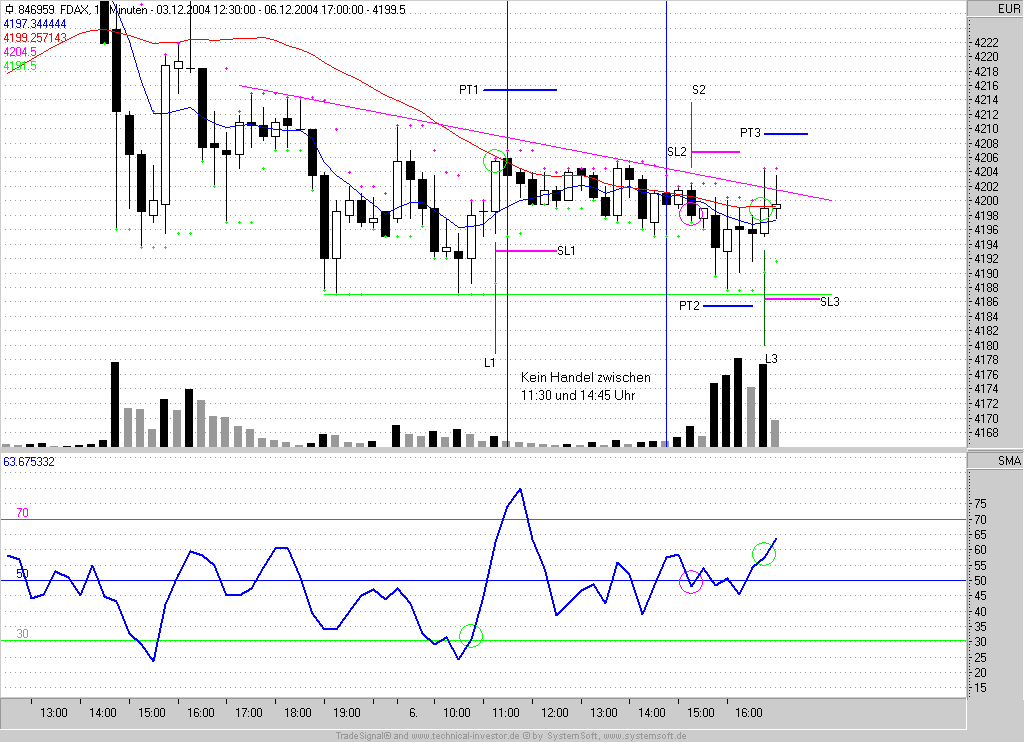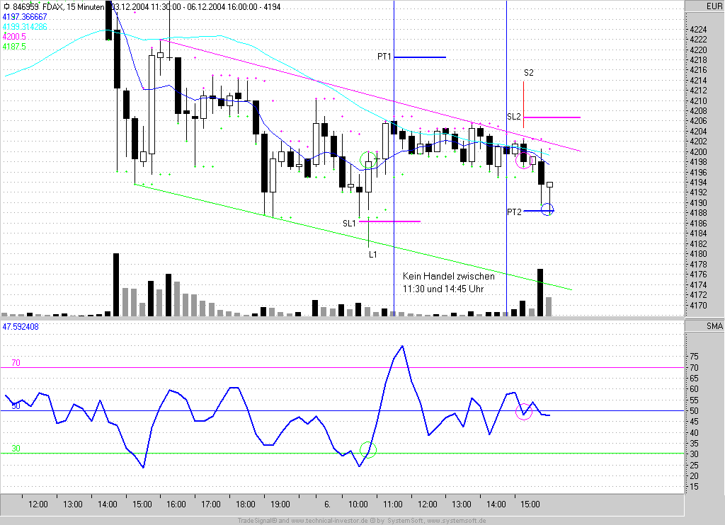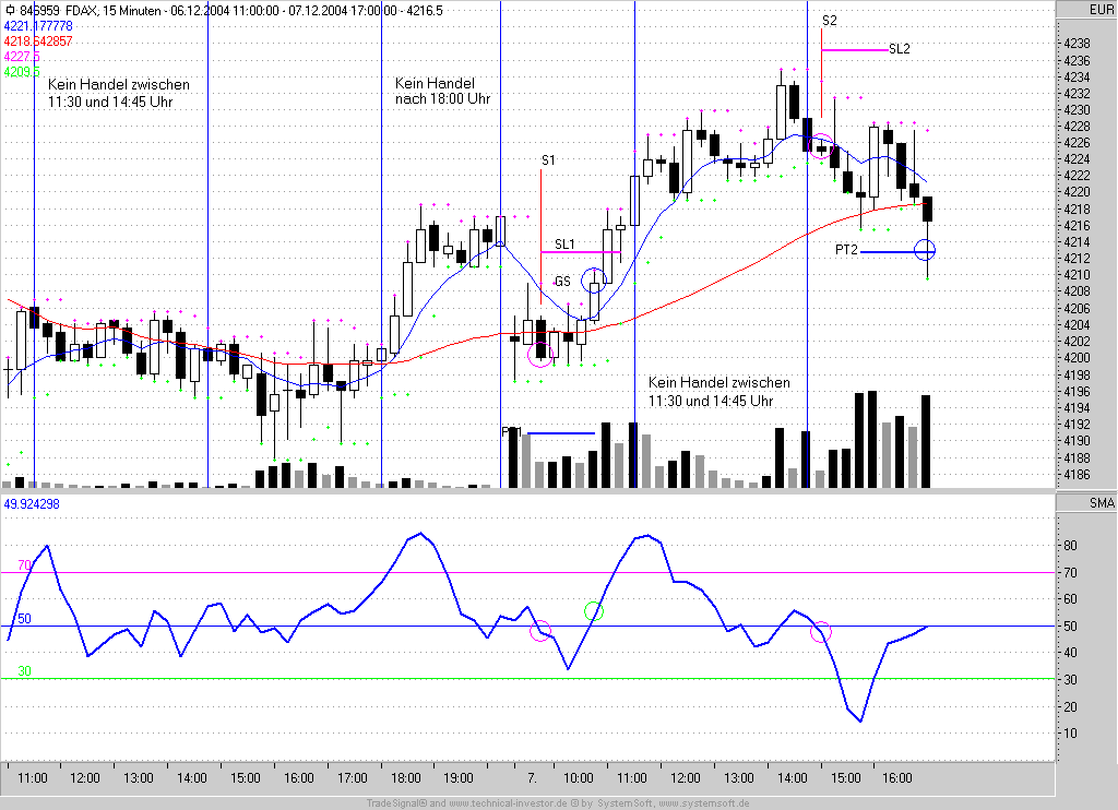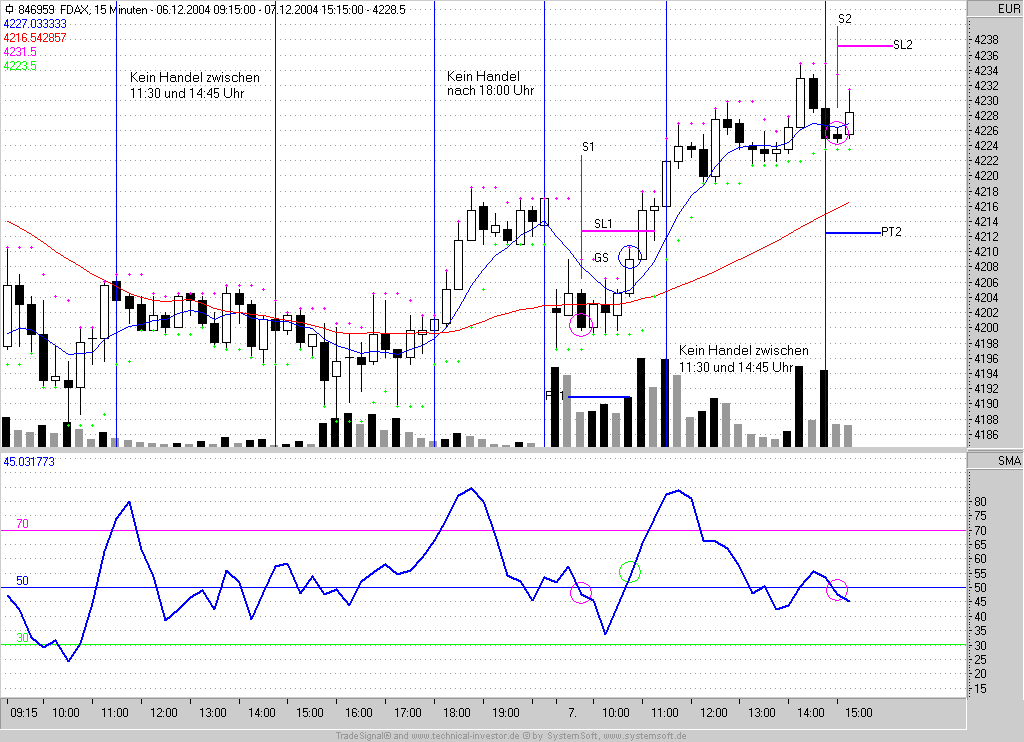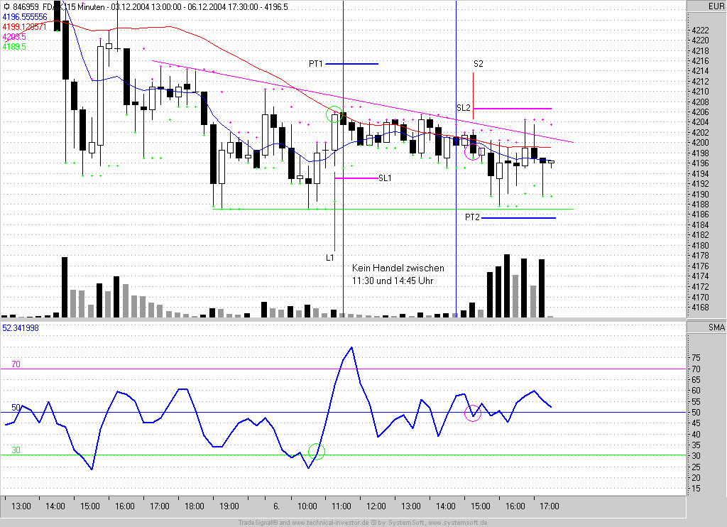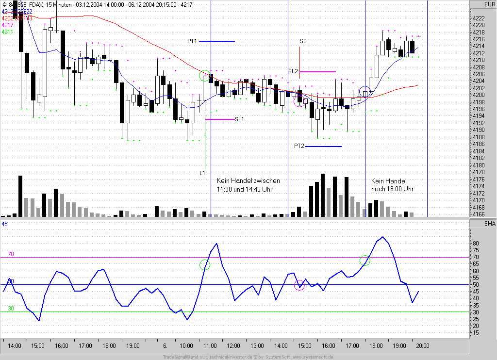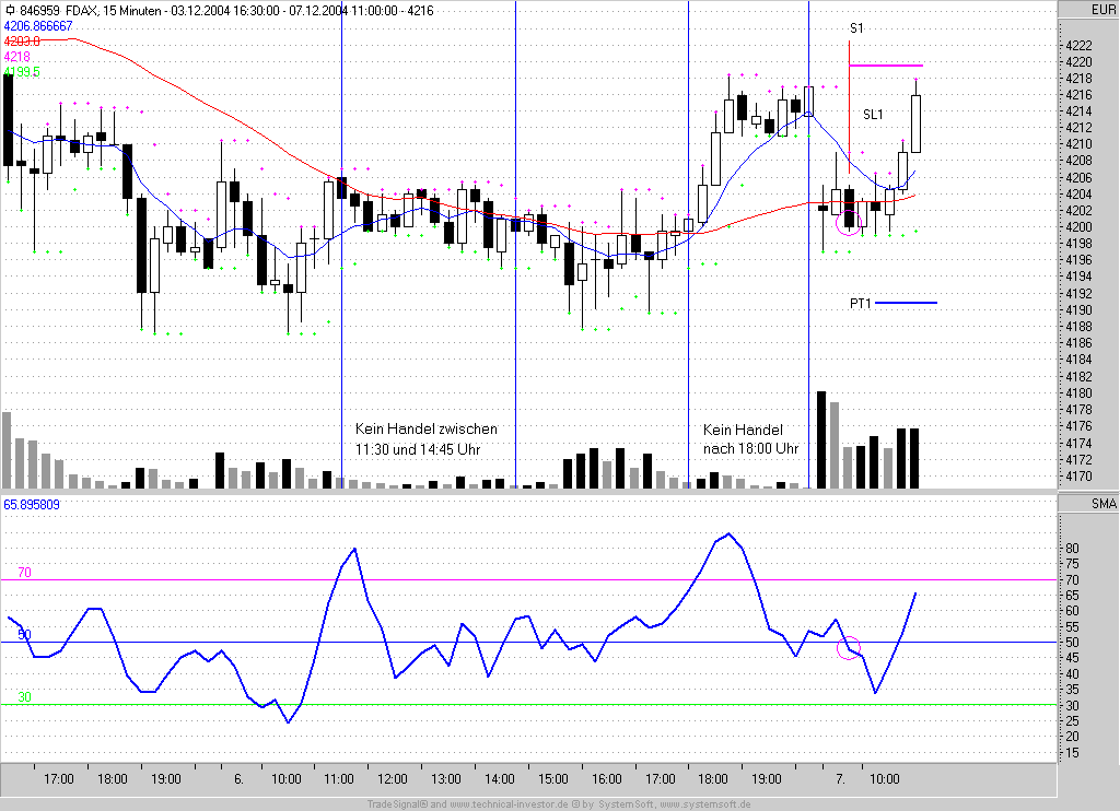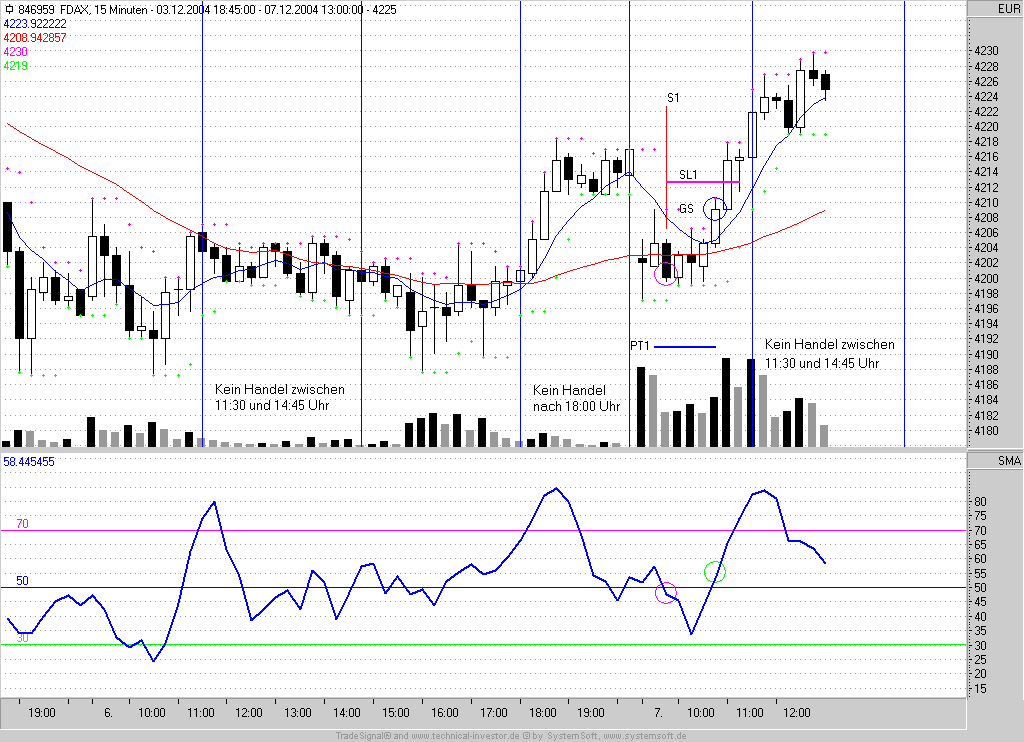 Ein weiteres Long-Signal wurde in der Folge um 11:30 bei 4222,0 generiert, da nunmehr der Tagestrend gedreht hatte. Dies wurde aber wiederum durch die "Handelszeitbeschränkung" und den Oszillatorenstand von >70% unterdrückt. Also wieder Nichts.