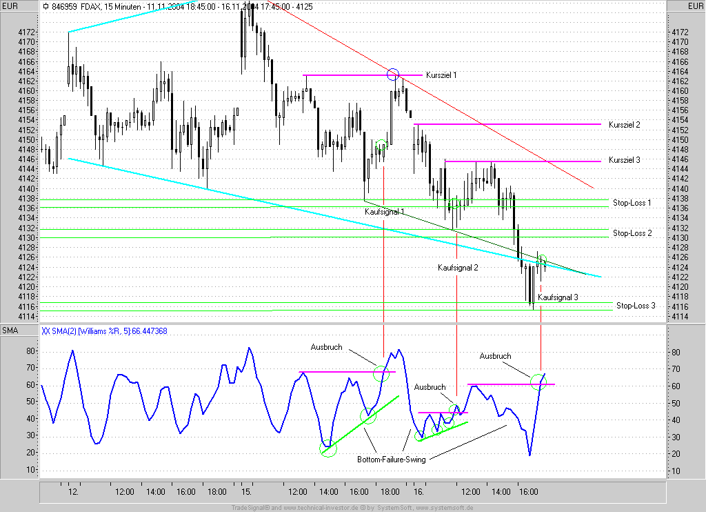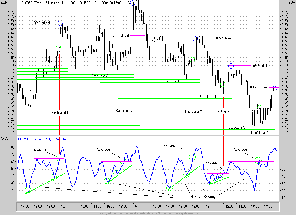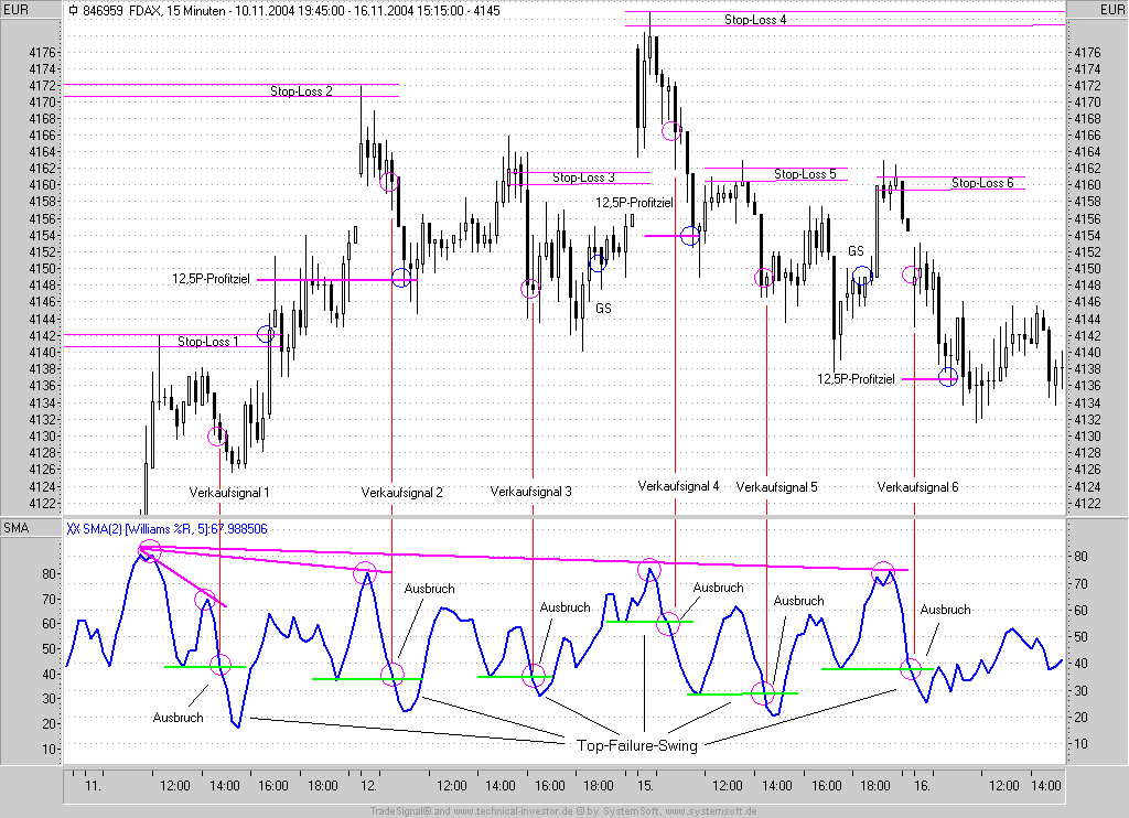 Also sozusagen als "Top-Failure Swing", der dann eben im umgekehrten Sinne über eine Divergenz im Oszillator, welcher in den überkauften Bereich vorgedrungen ist, und bei Unterschreitung der Talsohle dann entsprechend ein Short Signal auslöst ?