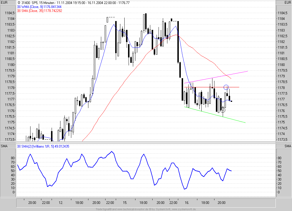 Broadening Bottom als potentielle Umkehrformation. Kauf zwei Kontrakte im Future bei 1177,25. SL bei 1175,25.