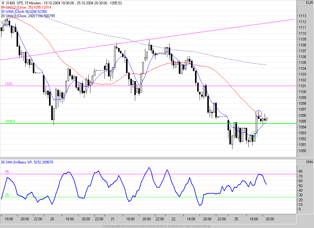 Da die Position am TS gut abgesichert ist und nicht mehr in den Verlust laufen kann, erfolgt der Verkauf des verbliebenen Kontraktes nicht bei MA-Cross, da dieser bei einer derzeit nur geringen Handelsspanne in den nächsten Perioden auch ohne Momentum stattfinden kann, sondern nur am Profit-Target bei 1104,0 (200-Perioden-SMA der bekanntlich als Widerstand fungiert). Alternativ kann hier der vorgeschaltete Widerstand bei 1101,0 zu Gewinnmitnahmen genutzt werden.