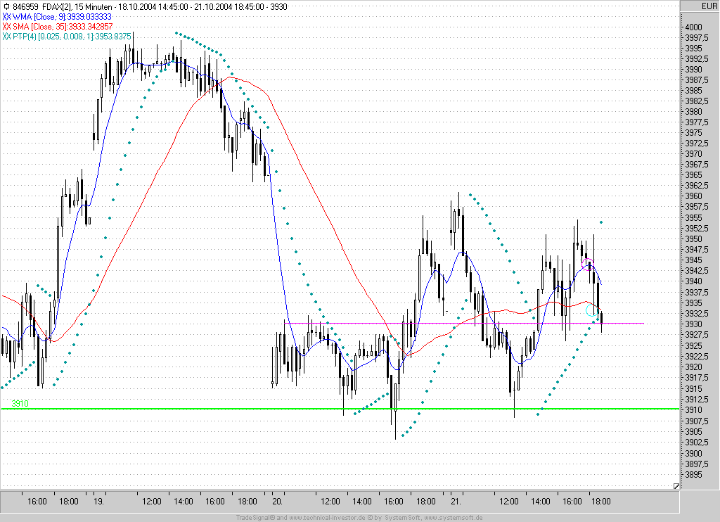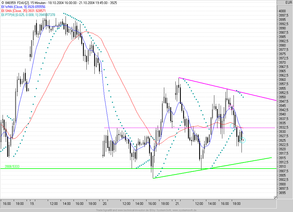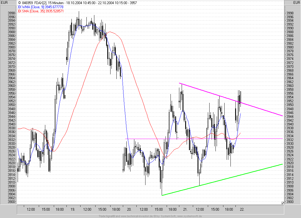 Hätte man die volle Position gehandelt, dann wäre ein Kontrakt bei 3941,0 mit +8,5P glattgestellt worden. Der SL für den verbleibenden Kontrakt läge dann auf Break-Even der Gesamt-Position, somit bei 3958,0.
