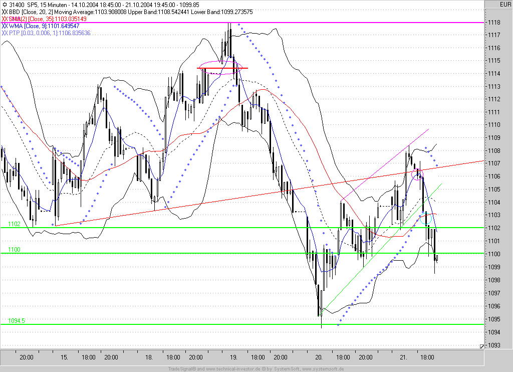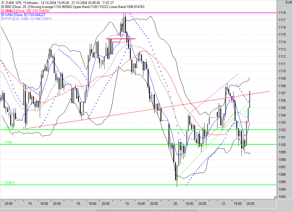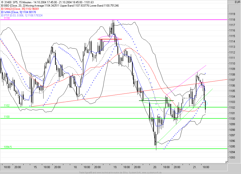 Na ja - im nachhinein betrachtet hätte man sich wohl an das Setup halten müssen, dies hätte 5P mehr gebracht. Aber was soll´s. Der Kontrakt wurde am TS ausgestoppt.