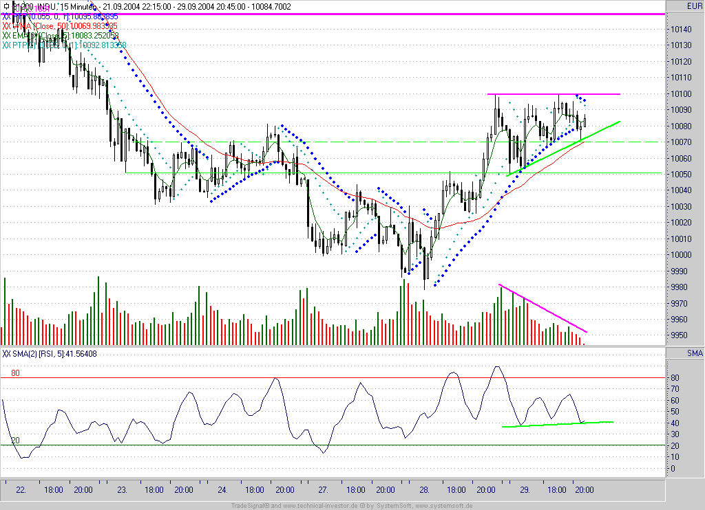 Der DJIA konsolidiert derzeit bullisch in einem aufsteigenden Dreieck. Eine erste Teilposition wird bei nochmaligem Erreichen der 10380 aufgenommen (SL unter 10050). Die zweite Position wird bei Ausbruch über 10100 angestrebt. Das Kursziel der Formation läge dann bei 10150.