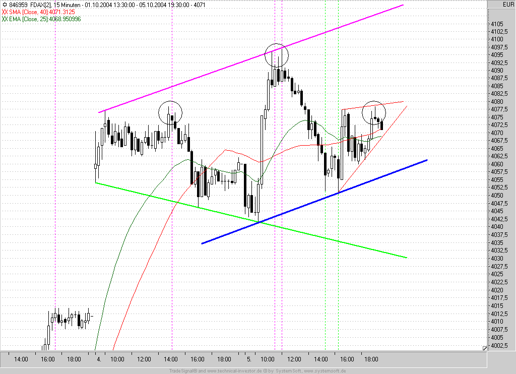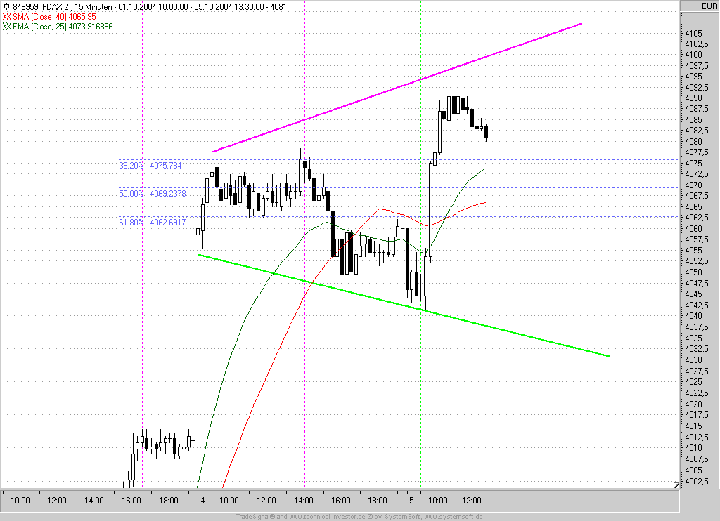 Heute besteht wieder die Möglichkiet sich an einem inversen Dreieck zu "versuchen". Hierzu wird ein Rücklauf bis unter das 50%-Retracement bei 4070,0 abgewartet. Alternativ kann auch ein direkter Ausbruch nach oben über 4098,0 gehandelt werden. Da das Zyklop-System derzeit auch long ist bevorzuge ich jedoch die 1. Variante und setzte diese Strategie dann mit einem Zertifikat um.
