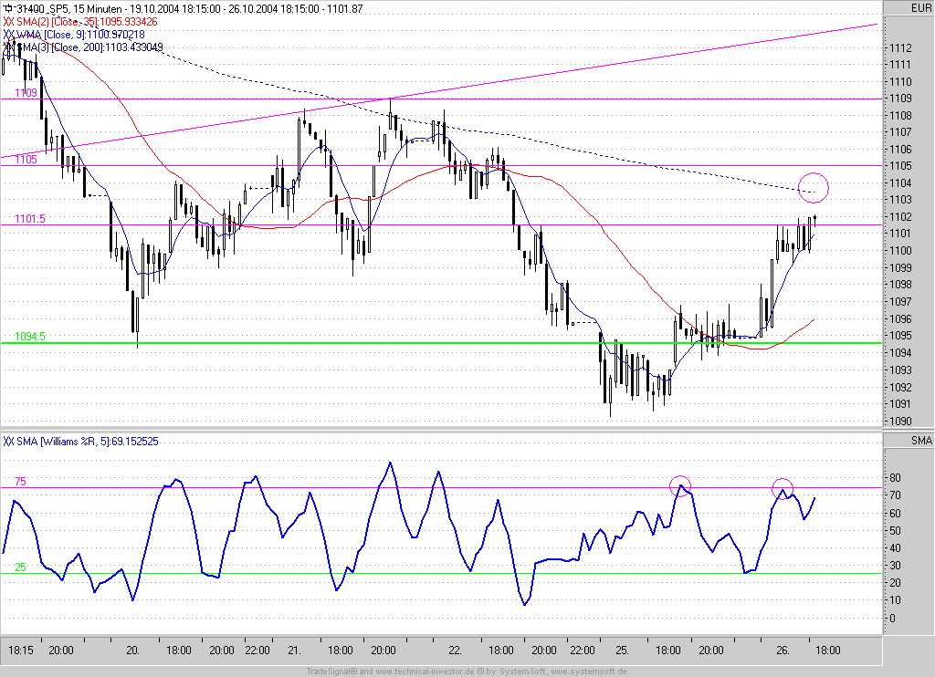 Derzeit behalte ich eigentlich nur den SPX im Auge. Sollte dieser bis zu seinem 200er-Perioden-MA bei 1103,5 ansteigen können ist verstärkt auf Umkehrsignale zu achten, da dieser im 15min-Bereich auch bei den Big-Boys Beachtung findet und im aktuellen Abwärtstrend einen Widerstand darstellt. Zudem verläuft bei 1105,0/1106,0/1109,0 die nächsten Horizontalwiderstände. Da bei einer weiteren Aufwärtswelle in diesen Bereich der benutzte Oszillator seine bereits bis dato vorhandenen Divergenzen noch verstärken sollte, ist auf diesem Niveau eine Short-Position eingeplant. Zudem könnte sich im Anschluss an einen Abprall an dieser Marke ein Swing-Short-Trade ergeben. Den SL würde ich zunächst auf 1115,0 legen.