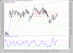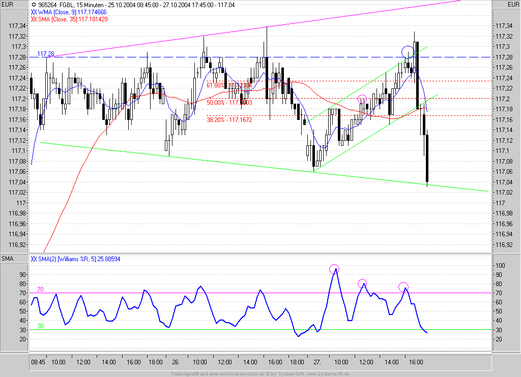 Im FGBL bildet sich nach einem Up-Gap in den Vortagen derzeit ein inverses Dreieck aus. Zudem liegen bereits Divergenzen im Oszillator vor. Ein 50%-Teilanstieg wurde nunmehr vollzogen. Der Einstieg erfolgte zu 117,19. SL derzeit auf 117,29. Das erste Profitziel liegt knapp über Gap-Close (116,93). Das Kursziel der Formation liegt ca. bei 116,76. Sollte sich der Ausbruch über die 117,0 lediglich als "Ausflug" entpuppen, liegt das erste Kursziel auf Daily-Basis weit tiefer bei 116,20.