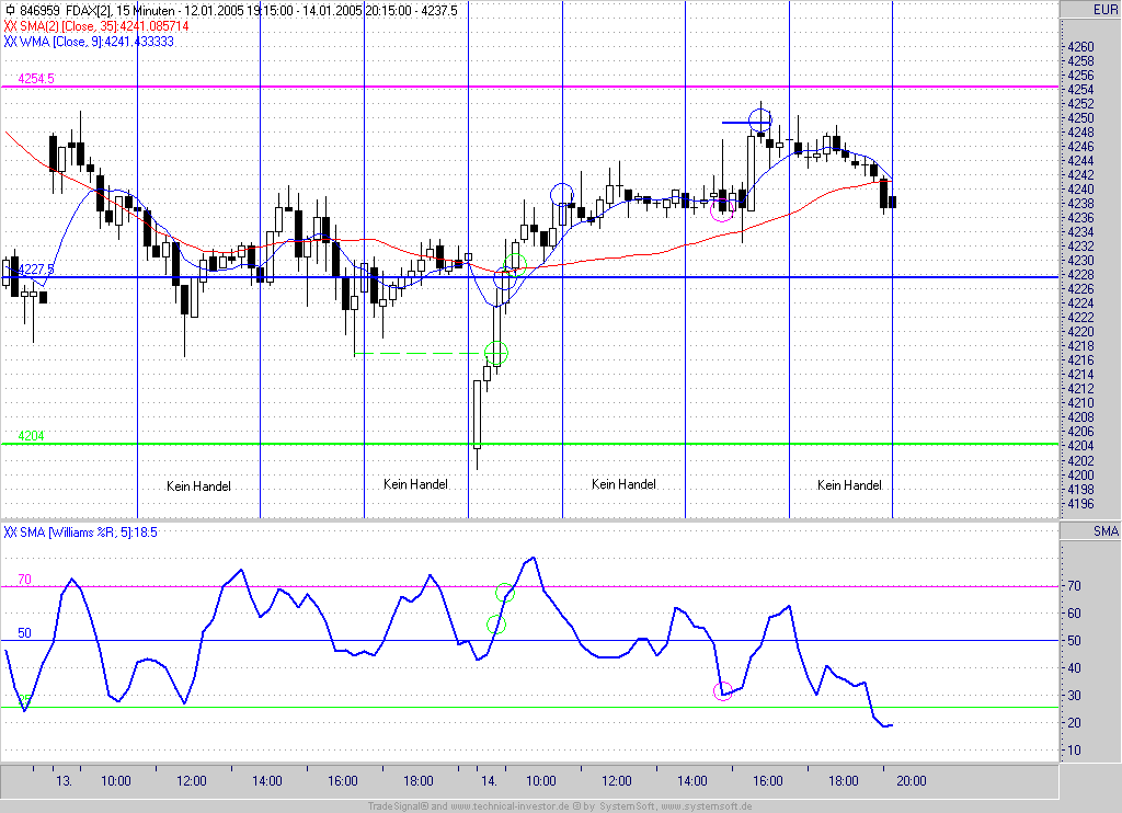 Der erste Short-Trade des Handelstages mußte am Gegensignal mit - 1,0P geschlossen werden. Die folgenden Long-Signale wurden jeweils am Profitziel mit +10,0P bzw. am IS mit -12,5P ausgestoppt. Tagesergebnis -3,5P.