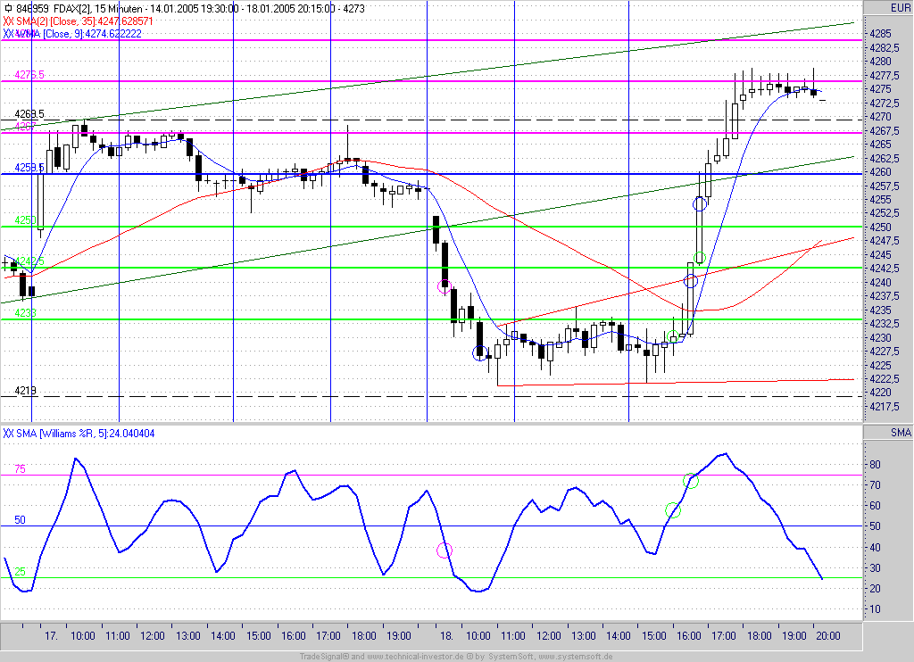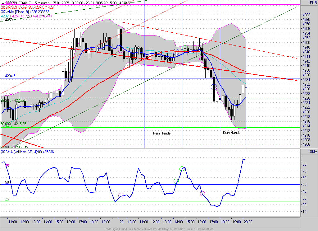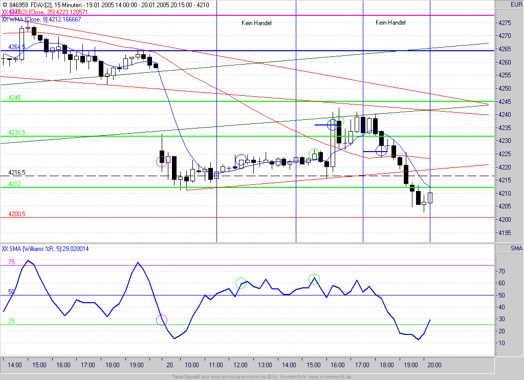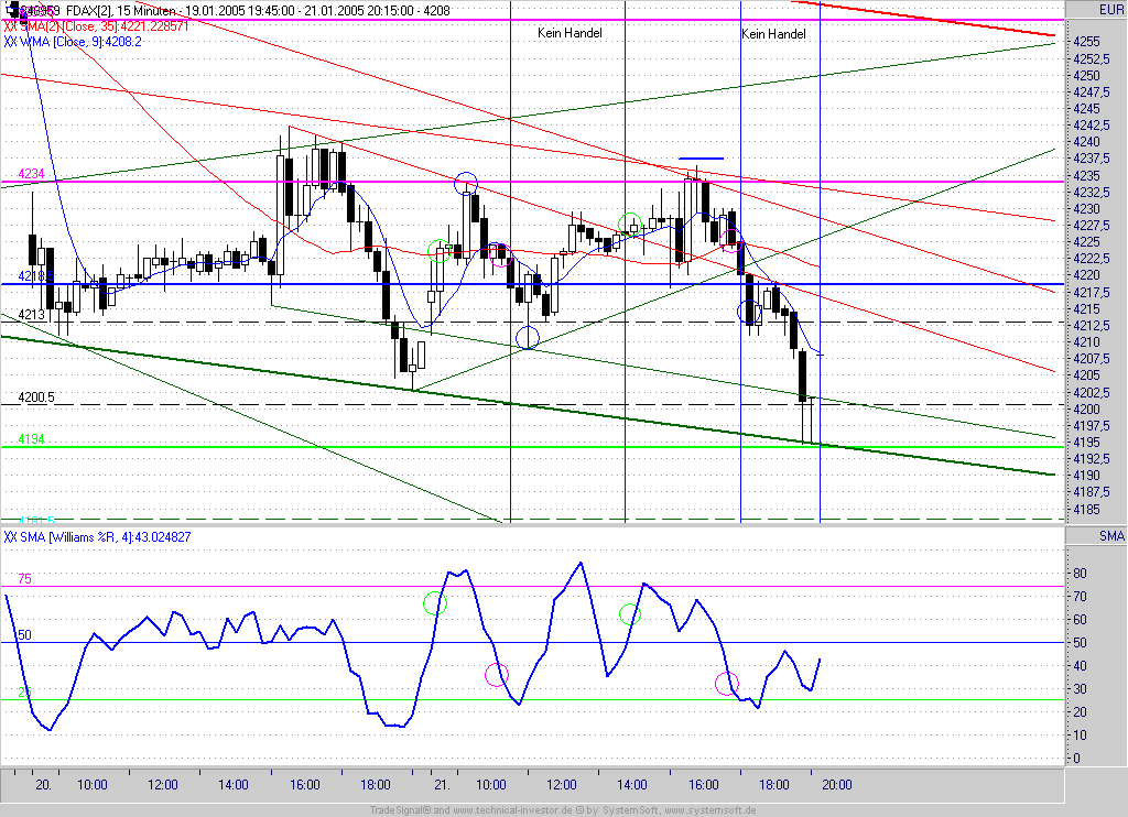 1. Long bei 4218,5 - 4228,5 (PT) mit +8,0P (Oops-Pattern-Strategie)