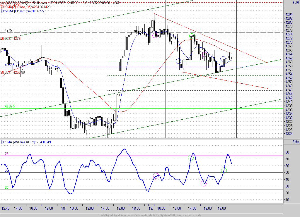 Im 15min-Bereich wäre heute der einzige Long-Trade am IS mit -12,5P am absoluten Tagestief geschlossen worden. Jeder "vernüftige" Trader hätte wohl die Position bereits mit Close der 13:45-Candle unter Daily-R1 bei 4258,5 glattgestellt, auch wenn zu diesem Zeitpunkt kein Short-Signal vorlag. Damit hätte man sich -6,0P Verlust erspart.