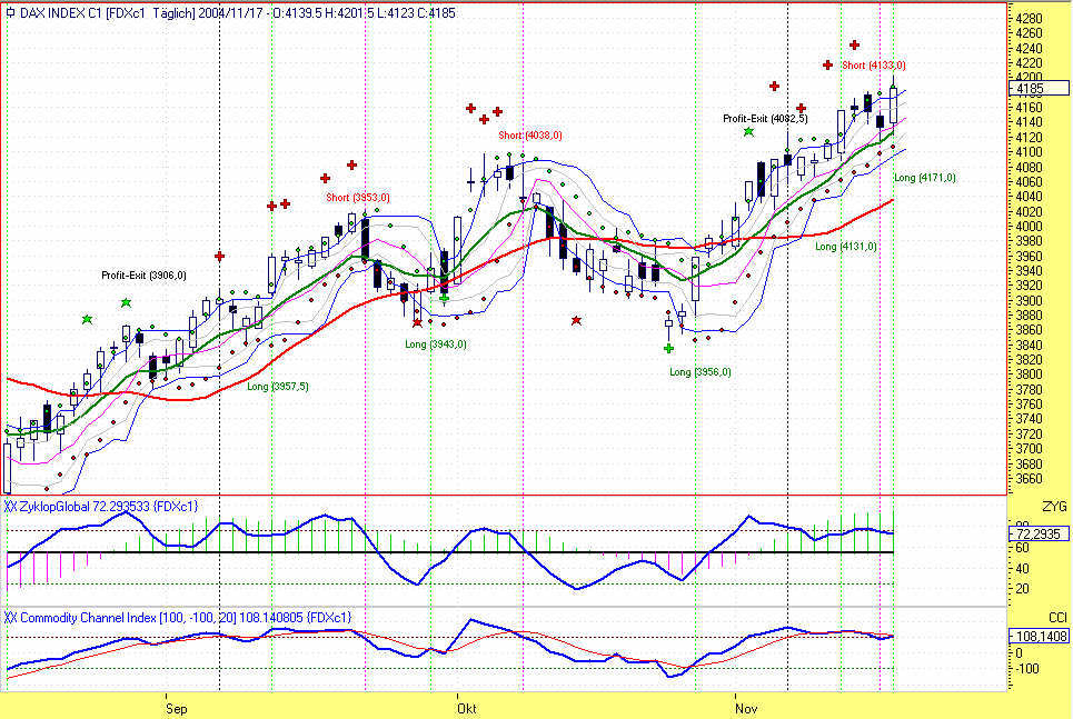 Die Long-Position wurde heute zu Handelsende verkauft. Entsprechend der Signallage war eine Short-Position zu eröffnen. Der SL liegt zunächst eng auf 4170,0.