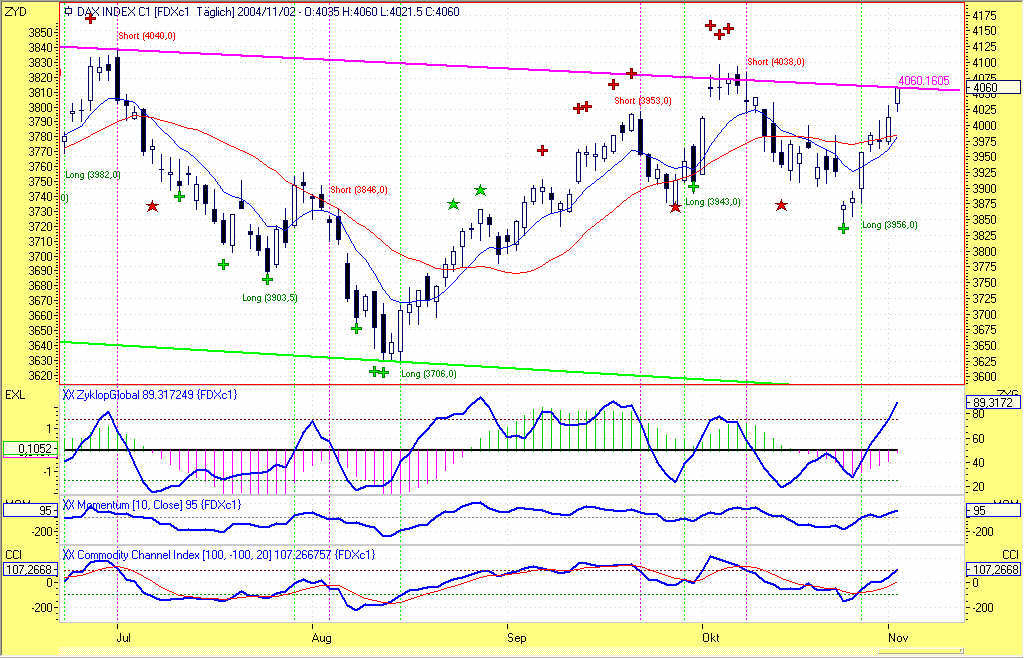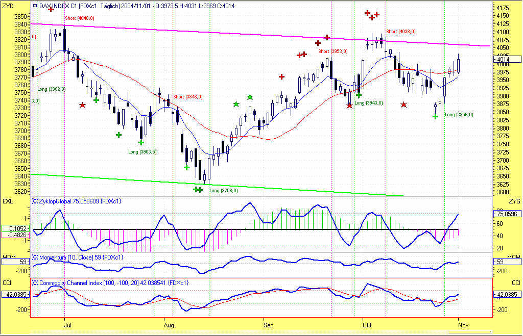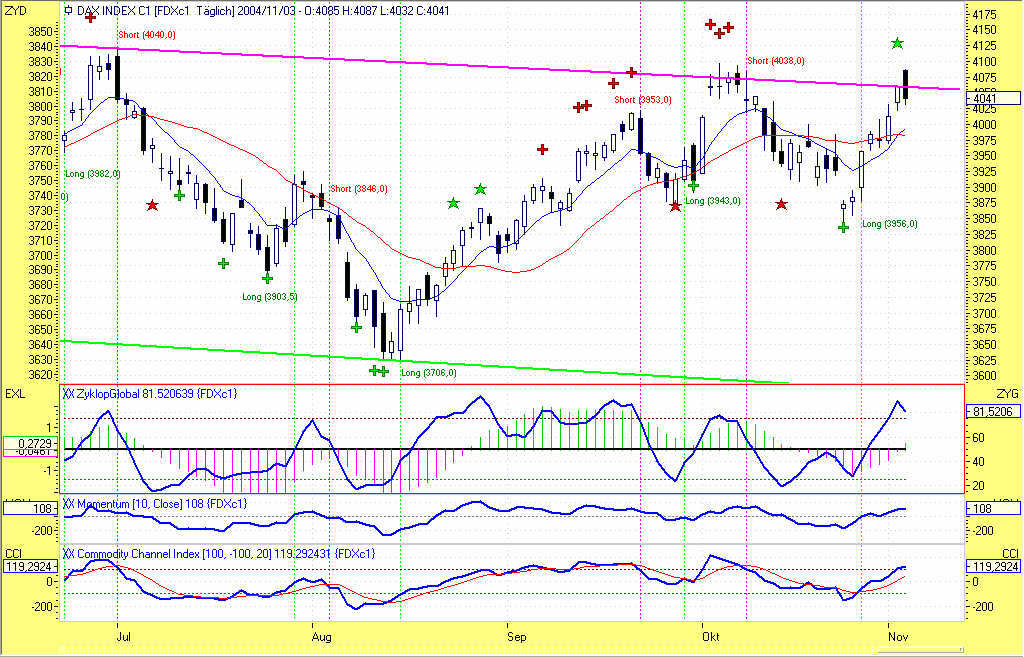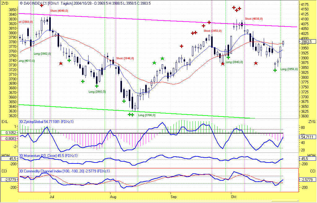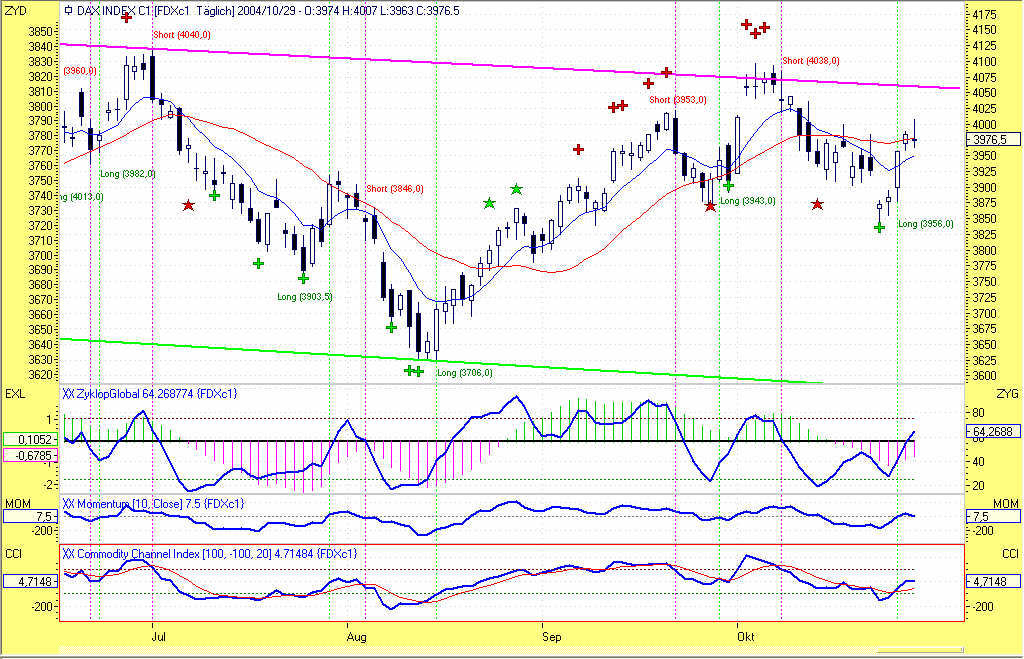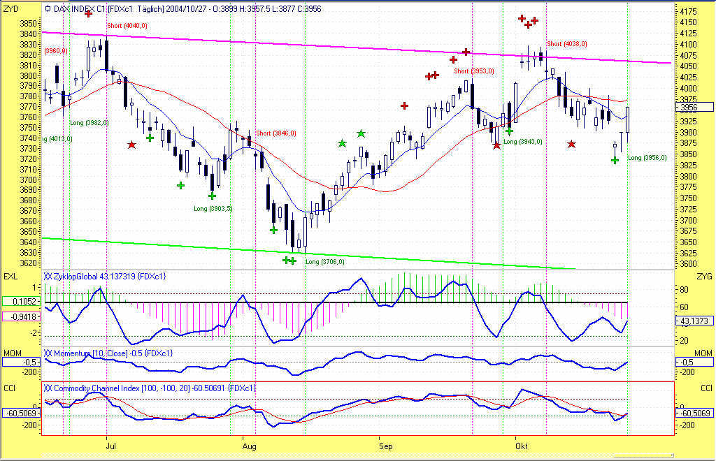 Wie aus dem beigefügten Chart ersichtlich ist, war heute der am 08.10.2004 bei 4038,0 eingegangene Short-Trade zum Handelsschluss aufgrund eines Gegensignals bei 3956,0 mit +82,0P glattzustellen. Das Long-Signal wurde zum selben Kurs gehandelt. Leider wurde im Vorfeld das 200P-Profitziel um lediglich 7P verfehlt. Dieser Umstand hat dem Trade leider 118P vom Buchgewinn "gekostet".