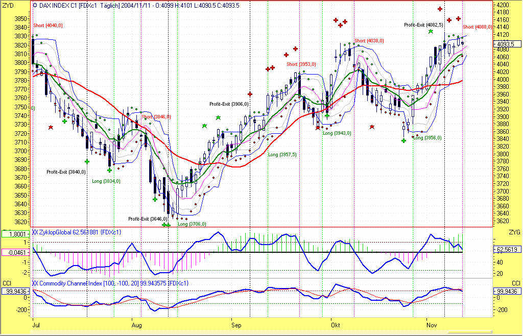 Schade - aber leider wurde das Profitziel bei 4140 heute um 13P verfehlt. Die Candle an dieser markanten Chartmarke im Zusammenhang mit den Divergenzen im Oszillator überzeugen mich nicht wirklich und deuten auf eine Erschöpfungszone hin. Daher habe ich mich entschlossen den Trade kurzfristig zu beenden und die weitere Entwicklung abzuwarten. Der Status des Systems steht derzeit jedoch noch auf Long. Das Vorgehen erkläre ich als Schließen der Position am Profitziel, da ich bei der letzten Short-Position zu steif an den Exit-Regeln hing und zuviel mit Gewalt erreichen wollte. Das Ergebnis steht ja in meinem ersten Beitrag hier im Thread. Lieber den Spatz in der Hand als die Taube auf dem Dach. Ein Re-Entry ist bei 4042,0 eingeplant.