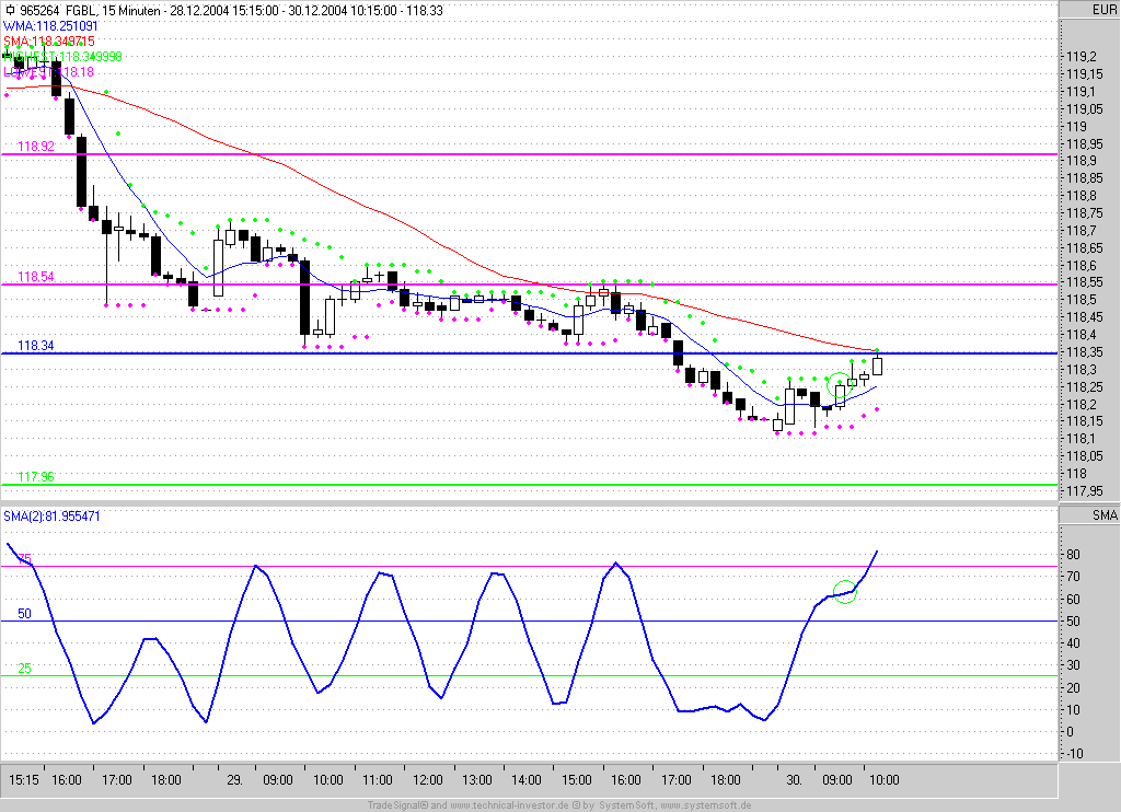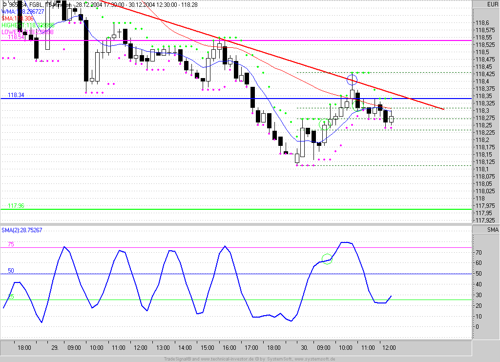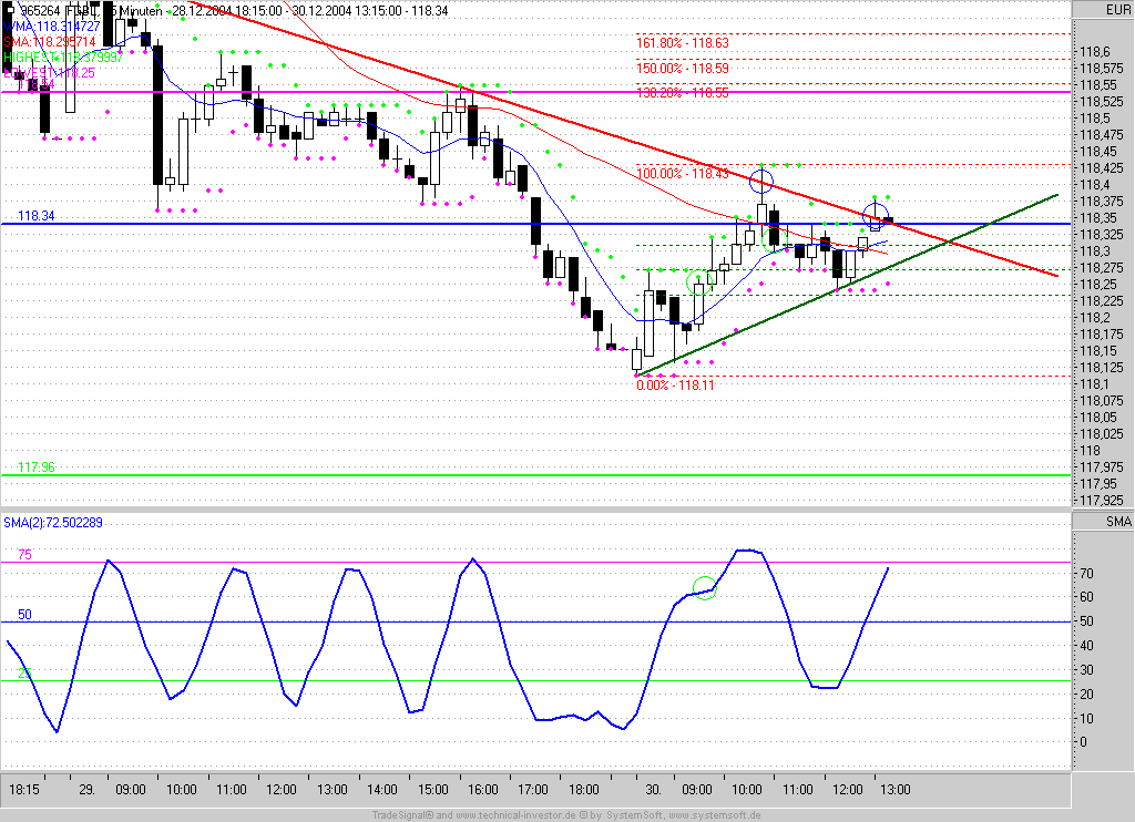 Das Long-Signal im 15min-BuFu-STrade würde ich, jeh nachdem ob die 118,34 überwunden werden können, dann mit einem 118,39er Kursziel handeln. ich bleibe daher noch in der Position drin und lege den SL auf Einstand (118,25).