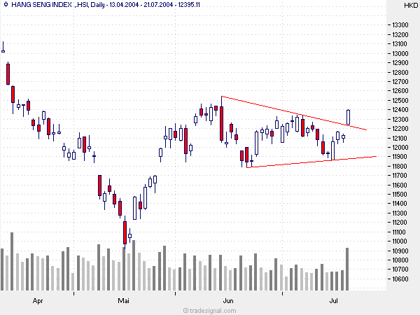 der Hang-Seng bricht heute aus einem Konsolidierungs-Dreieck nach oben aus. Interessant für einen long. Sl würde ich auf das letzte Tief legen.