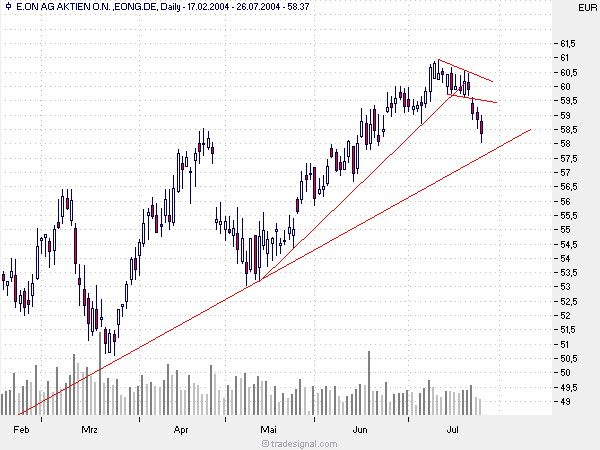gebrochen. es fehlt allein noch der bruch der unteren trendlinie.