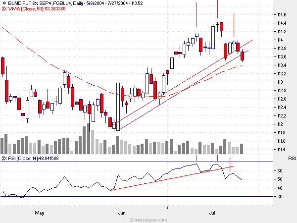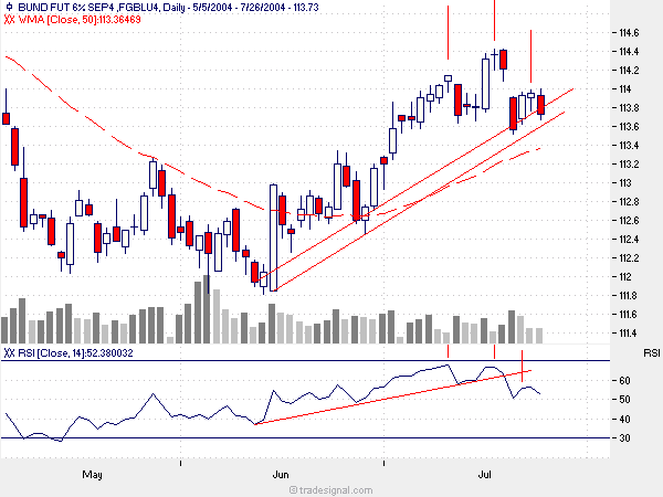 nachdem der us-bond markt heute schwach war, dürfte der bund-future am 28.7. auch weiter nachgeben und den bruch des aufwärtstrendes bestätigen. der frühzeitige shorteinstieg nach dem ersten evening star scheint sich jetzt zu lohnen. bloß werde ich in zukunft wohl erst eine bestätigung für einen trendwechsel abwarten.
