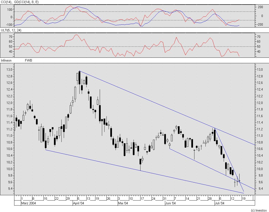 Die Aussichten für einen moderaten Anstieg nach oben stehen nicht schlecht. SlowStoch ganz unten, TD3 noch nicht überverkauft, RSI im neutralen Bereich fallend. Einstiegsmöglichkeit ergäbe sich bei ca. 13,10, SL knapp unterhalb des letzten Tiefs (12,80). Erstes Ziel wären 14,00. Bei Überschreiten dieser Marke SL auf 13,50 nachziehen.