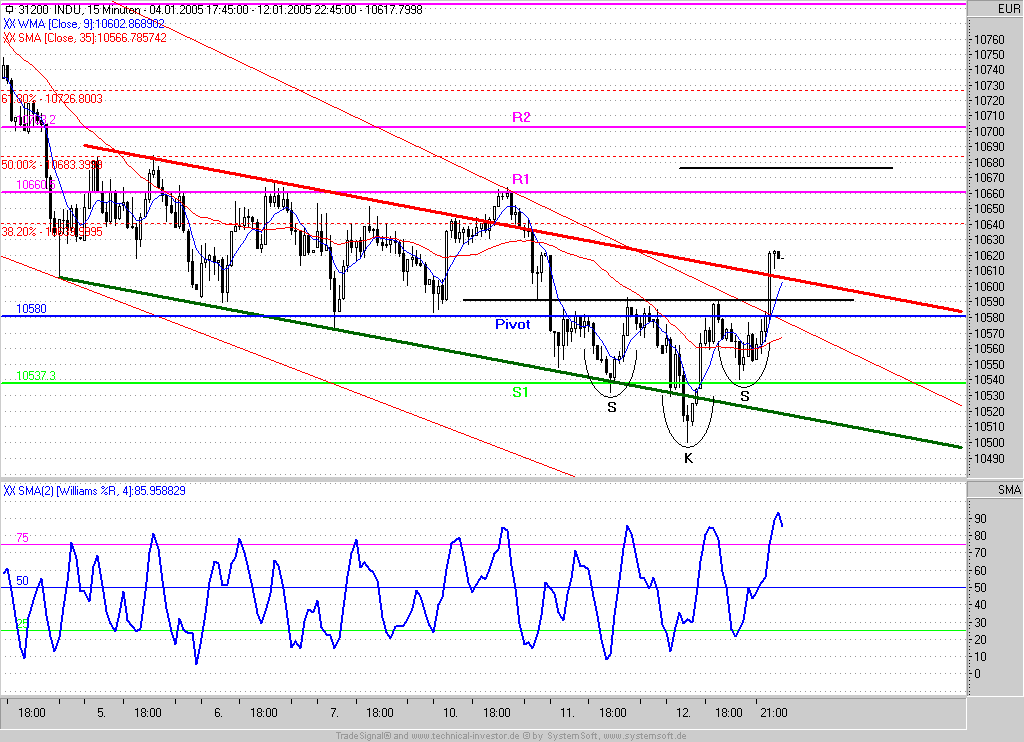 Im morgigen Handelsverlauf wird versucht einen Rebound an die Nackenlinie prozyklisch Long zu handeln, sofern zudem die Setup-Bedingungen des "STrade" vorliegen. Der SL liegt je nach Einstieg max. 25P unter Einstand. Das Profitziel kann mit einem Indexstand von 10578 bestimmt werden.