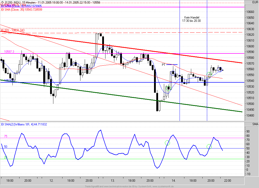 Der Dow-Jones-Future ließ heute 2 Signale zu. Der lukrativere Short-Trade wurde meinerseits allerdings wegen Abwesenheit nicht gehandelt. Schade eigentlich. Systemergebnis +59P.