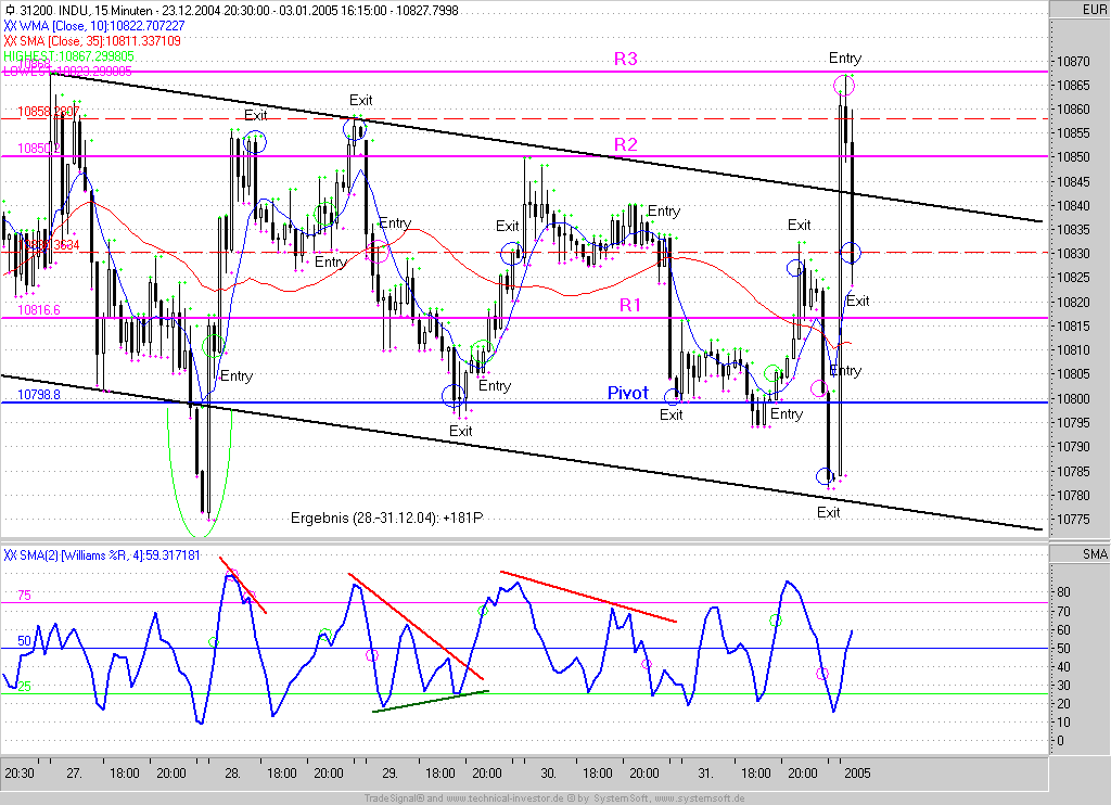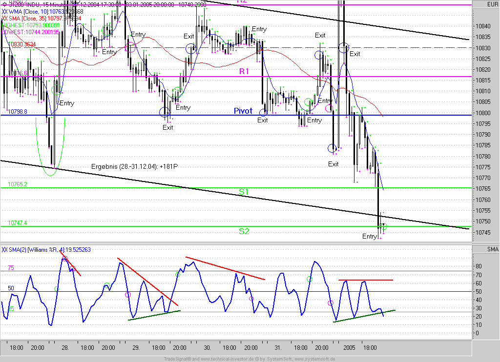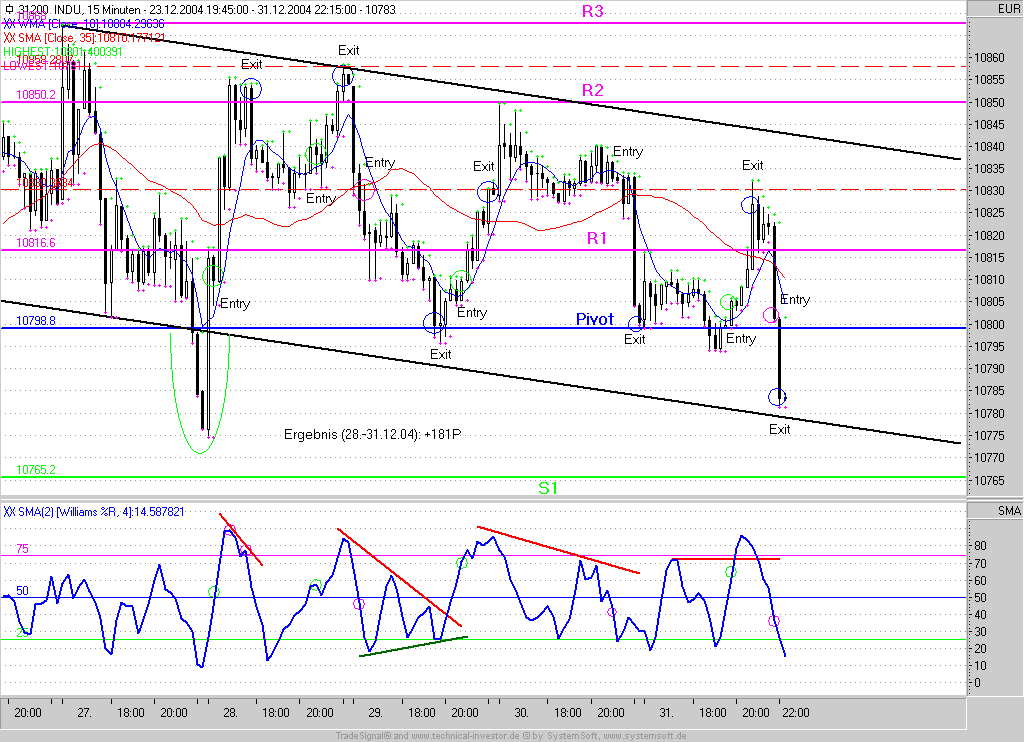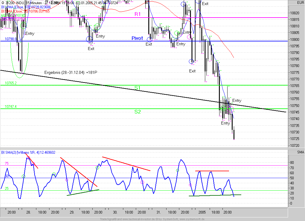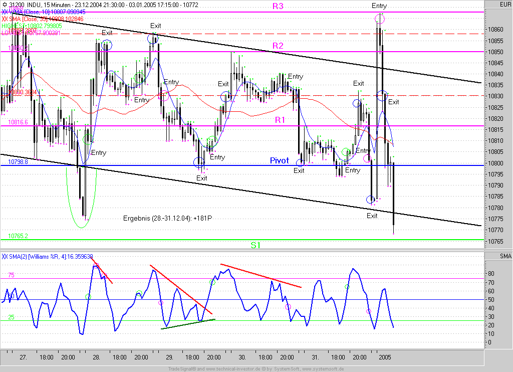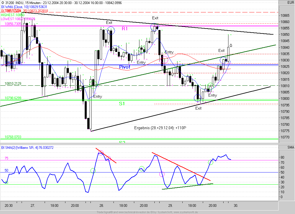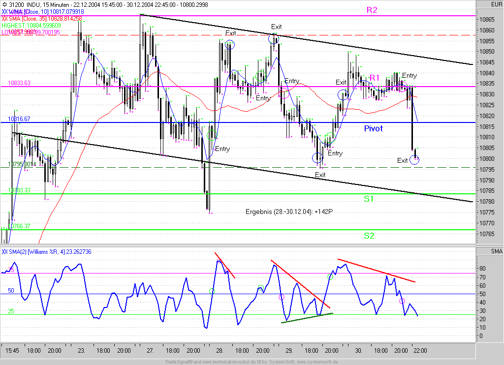 Die antizyklische Short-Position wurde soeben mit +35,0P glattgestellt. Der Einstieg erfolgte knapp unter dem bisherigen Zwischenhoch, zugleich Daily-R3, nachdem der Dow-Future bereits wenige Minuten nach Handelsbeginn 105P im Plus notierte. Der Exit wurde bei 10830,0 vorgenommen.