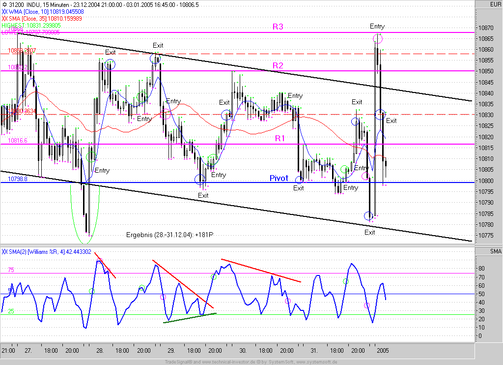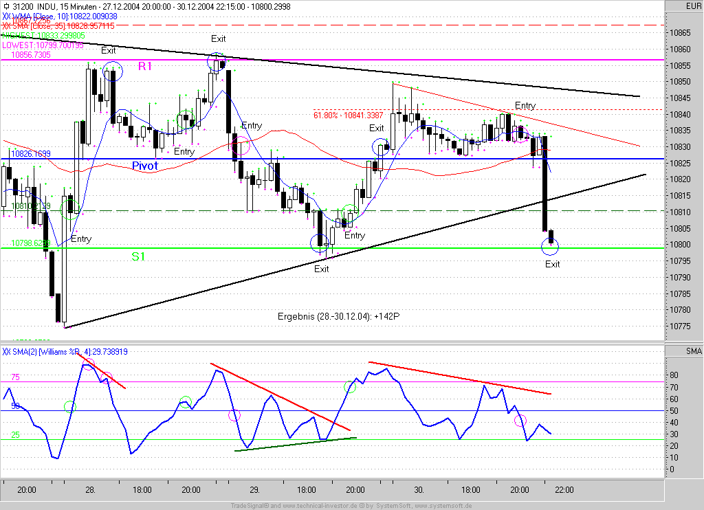 Just 15min später gab es dann ein entsprechendes STrade-Signal nach einem kleinen Doppeltop am 61%-Retracement. Einstieg bei 10832 (10837) und Exit zum Handelsschluß 10800 (10805). Momentan steht der Future sogar noch 10P tiefer bei 10795. Macht heute +32P.
