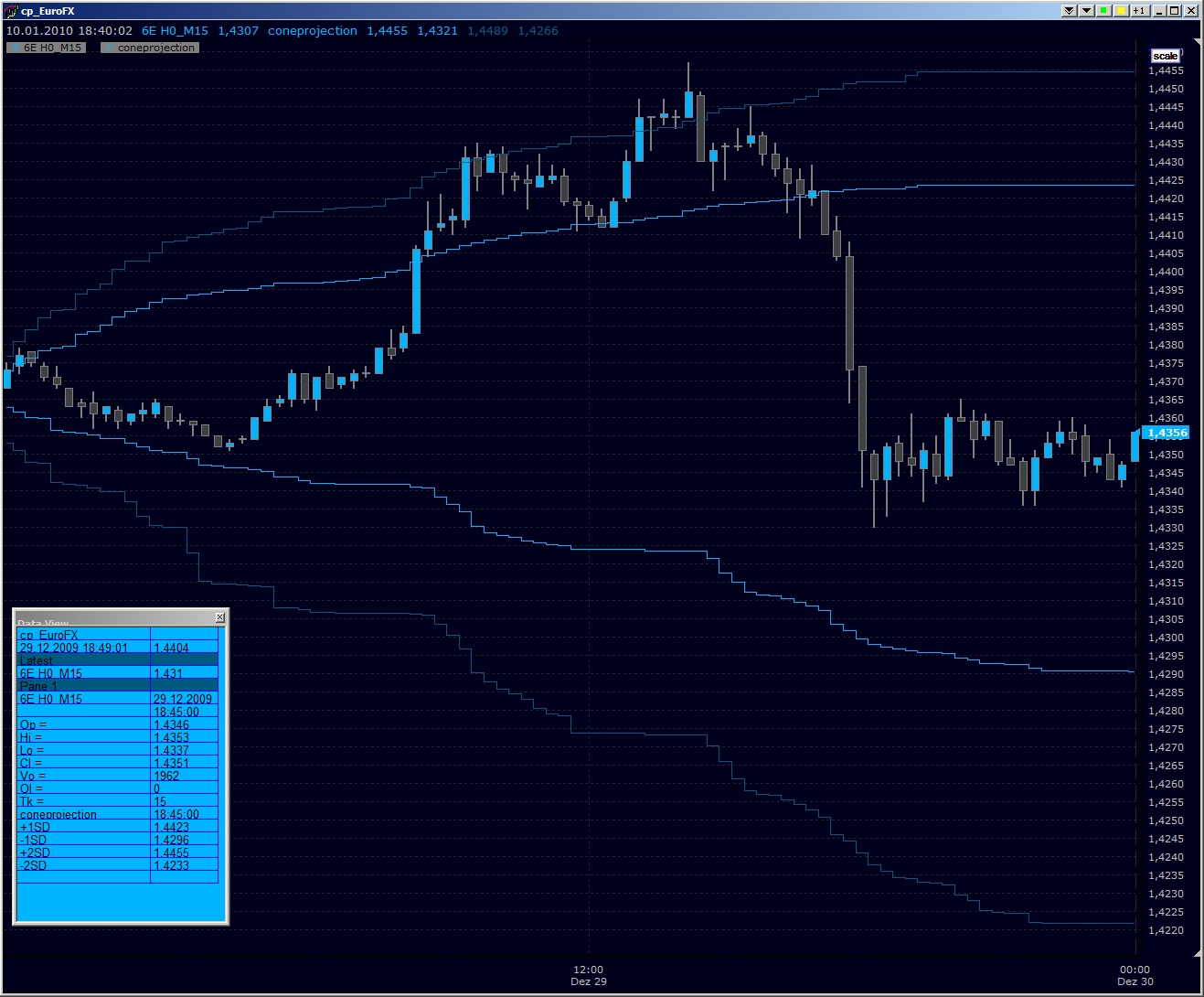 Was ich in dem Zusammenhang auch noch recht brauchbar finde, ist dass man sich nicht nur die durchschnittliche Spanne der einzelnen Bars ansieht, sondern auch wann und um durchschnittlich wie viel neue Tageshochs bzw. -tiefs entstehen. Wenn man das plottet, kommt so etwas ähnliches raus wie der Probability Cone, der bei Optionstradern vielfach im Einsatz ist. Ich hab unten einen Beispielchart angehängt. Die inneren Plots sind die Durchschnitte neuer Hochs/Tiefs, die äusseren jeweils eine Standardabweichung davon entfernt. Ganz rechts im Chart zeigen die 2 inneren Plots die durchschnittliche Tages-Spanne an, die Werte davor sozusagen die durschnittliche Entwicklung über den Tag dieser Spanne. -