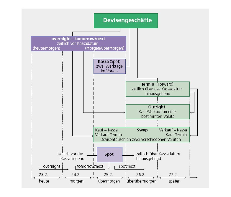 Grundsätzlich unterscheidet sich der Währungshandel in seinen Geschäftsformen vom Zeitpunkt der Erfüllung der Lieferverpflichtung, man unterscheidet Kassen-, Termin- und Swapgeschäfte sowie Futures.