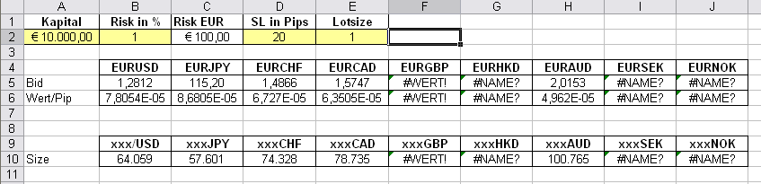 Zu deiner anderen Frage: Es ist ziemlich egal ob der EUR im Pair enthalten ist, soweit ich das jetzt im Kopf habe gibt es kein Pair, bei dem der EUR die zweitgenannte Währung ist, somit wird der Wert eines Pips immer von einer anderen Währung abhängig sein. Leichter ist die Berechnung des Risks natürlich wenn es ein EURxxx Pair ist, aber mit ein bisschen Spielraum zum maximalen Risk kann man auch andere Pairs handeln, wie eben GBPJPY, du musst dir eben überlegen wie lange ungefähr die Haltedauer sein könnte und dann noch den Worst Case im EURJPY berücksichtigen.