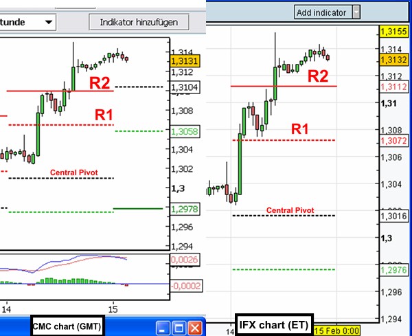 Das Bild zeigt einmal den gestrigen Tag mit seinen Pivots mit GMT-Zeit berechnet (0.00-0.00GMT) und rechts daneben mit ET-Zeit berechnet