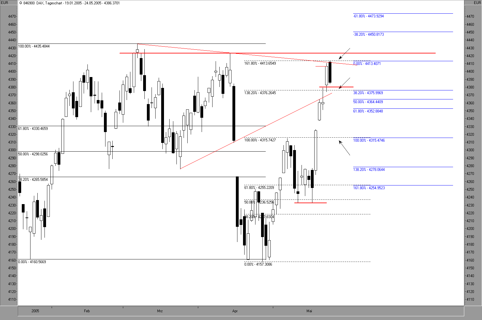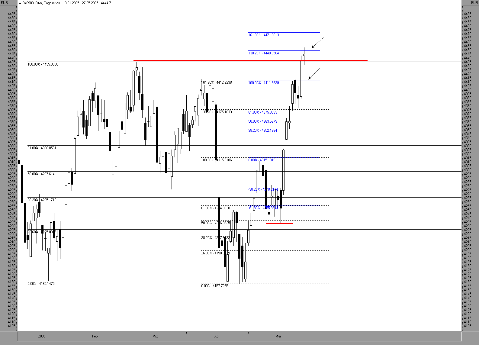 Ich hab jedoch nunmehr nur noch einen Candlechart mit 1 Bollinger-Band in der Einstellung 20/2,618 (irgendwas zwischen 2,6 und 2,7 tuts auch; der Wert ist eher eine Spielerei), sowie einem Fibonacci-Raster. Letzteres ist die Grundlage; mit Hilfe des Bollinger Bandes wird an neuralgischen Punkten die Marktdynamik bestimmt.