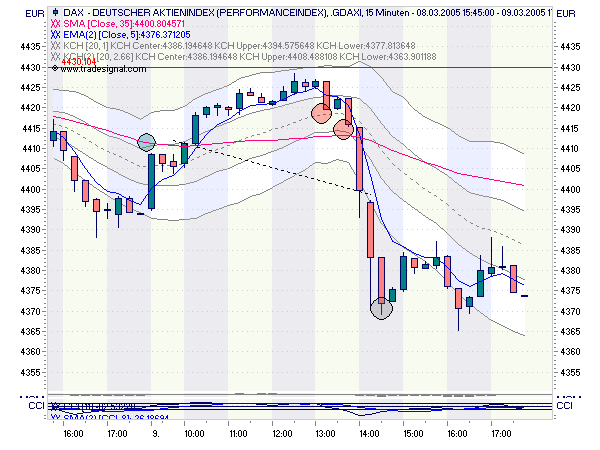 (Weiteres Hilfsmittel: in einer Trendsituation befindet sich der EMA5 immer im dem SMA35 gegenüberliegenden KCH2 Feld, also im oberen Feld in Long-Lage, im unteren in Short-Lage)