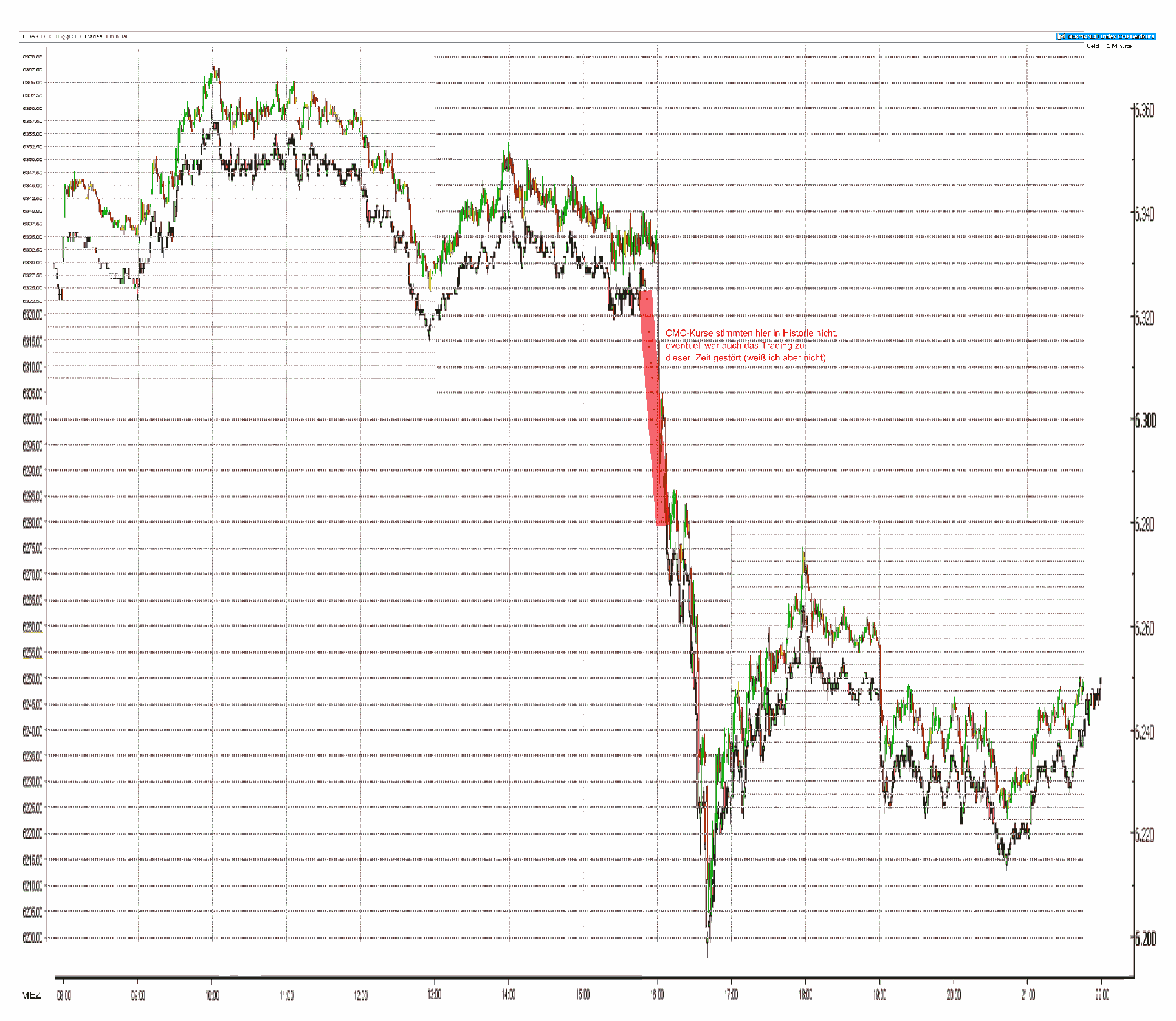 Wenn amazon95 irgendwo innerhalb des FDAX-Absturzes oder unmittelbar danach in den Trade reingekommen wäre, hätte er alleine mit Halten bis zum Tagestief nur 45 min später schon 76 Punkte machen können, mit der folgenden Erholung nochmal fast soviel und mit dem zweiten Absturz und der abendlichen Erholung wiederum. Allzu verächtig muß da gar nichts sein.