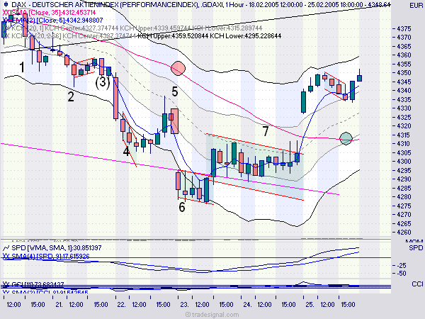 Ansonsten hat man den KCH2 als Umkehrpunkt. Jetzt muß man nur sehen, wann man am besten reinkommt bzw. ob eine Trendsituation vorliegt (das ist auch ziemlich einfach, lassen wir das Antizipieren mal weg), und/oder tut sich irgendwo ein Widerstand auf.