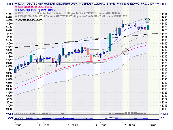 (Weiteres Hilfsmittel: in einer Trendsituation befindet sich der EMA5 immer im dem SMA35 gegenüberliegenden KCH2 Feld, also im oberen Feld in Long-Lage, im unteren in Short-Lage)