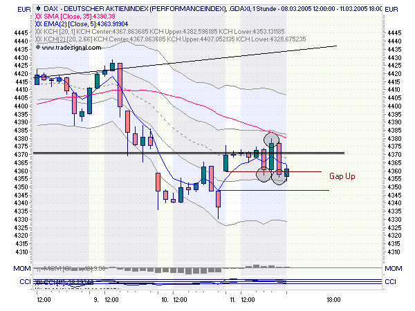 1) Um 15 Uhr eigentlich ein klares Short Signal, nach Abprall am 4370-74 er Widerstand. Im Sinne des Systems wahlweise als Konter oder Re-Short einzustufen.