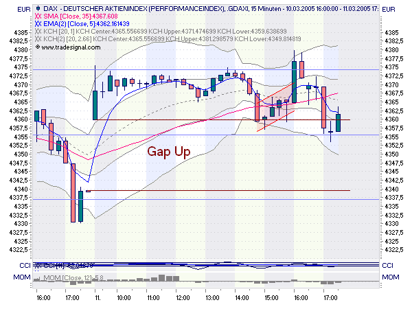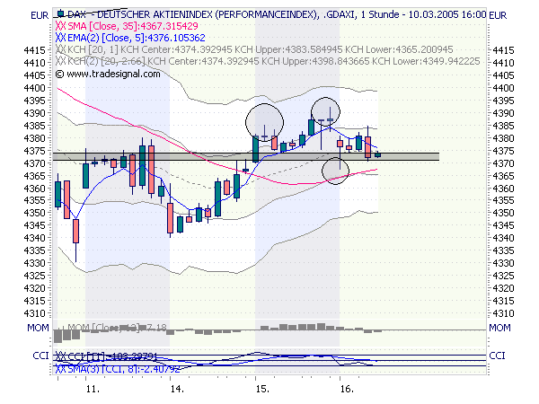 Worauf noch zu achten ist (gerade im Dax15 gut zu beobachten): scheinbar verstärkt sich dort die LongTRendlage; tatsächlich verengt sich aber nur der KCH, und scheint leicht zur Seite einzuschwenken, was eine Abschwächung der Aufwärtsbewegung signalisierte.