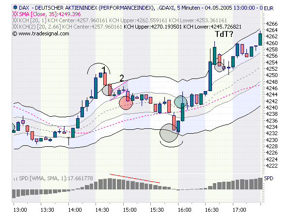beim stop-buy einstieg über dem hoch der letzten korrekturcandle (1. kreis - fdax 4265,5) betrug die "luft" zum vorangegangenen hoch zudem 6 pt. zu beachten war hier aber v.a., dass das hoch auch dem hoch der eröffnung entsprach, also die gefahr eines doppelhochs nicht gerade gering war. daher war es ratsam, den stop schnell auf einstand zu ziehen (mache ich ohnehin beim tdt noch ein bisschen schneller als sonst).